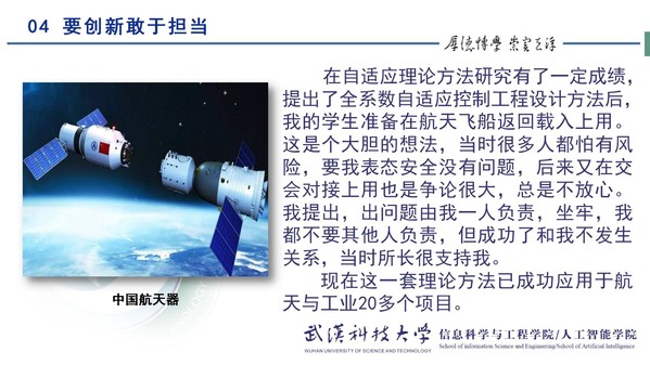 吴宏鑫主要讲述了在其本人伴随着我国自适应控制领域发展的历程。自适应控制最早是1954年由Tsien在《工程控制论》一书中提出的。吴宏鑫在接触自适应控制时,我国的自适应控制刚刚起步,那时吴宏鑫的恩师是一位从美国回国的专家杨嘉墀院士,在指导他在自适应控制上进军的同时提到了未来将会面对的困难:“十年冷板凳”与“不能直接应用于航空航天”。但这并没有削减吴宏鑫的热情。