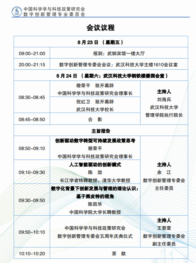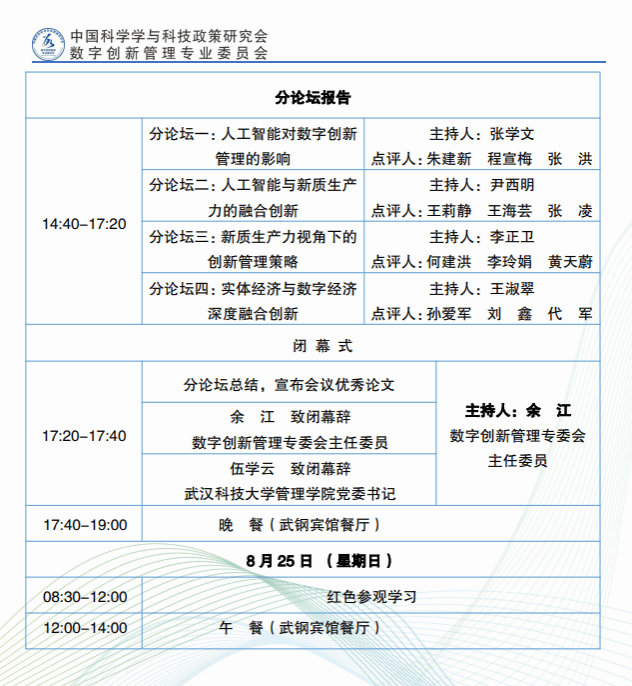 会议安排大会主旨报告、分论坛报告和专委会会员活动,围绕实体经济与数字经济深度融合、人工智能对数字创新管理的影响、人工智能与创新生态系统构建、人工智能与新质生产力的融合创新、新质生产力视角下的创新管理策略、数据驱动的创新管理策略等主题展开。