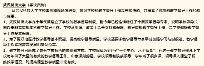 专家组对365完美的教学督导工作给予了充分肯定和认可:从365完美体育学校案例和现场演讲看,感到学校的教学督导工作是有传统的,并积累了成功的教学督导工作经验与成果。学校领导长期以来非常重视本科教学督导工作。教学督导工作紧跟教育发展形势站位高。教学督导已形成了具有学校特色的原则和方式,学校归结为8个字“一个中心、六个结合”,在这一教学督导理念下学校每年做了大量的有效的教学督导工作。