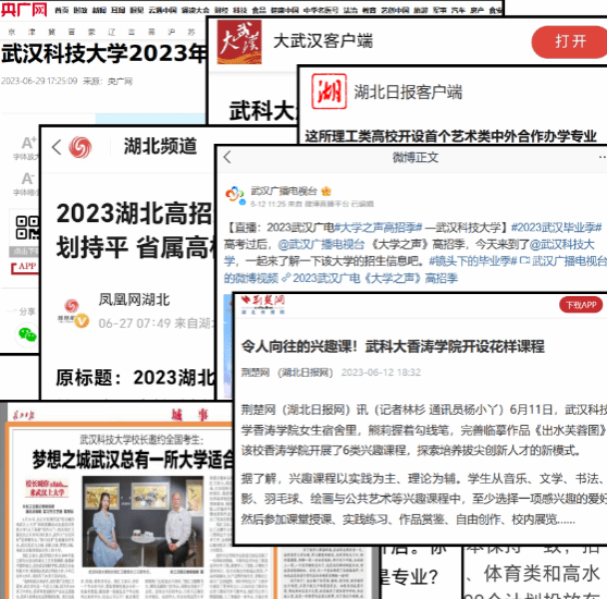 多方联动,激发内在宣传活力。在招生宣传密集期,积极组织各职能部门和学院(部)在中国教育在线、科技日报、湖北日报、长江日报、荆楚网、极目新闻、长江云等主流媒体与校内媒体发布招生宣传文案200余篇,开展“我和我的专业”“学院零距离”等系列直播近50场。