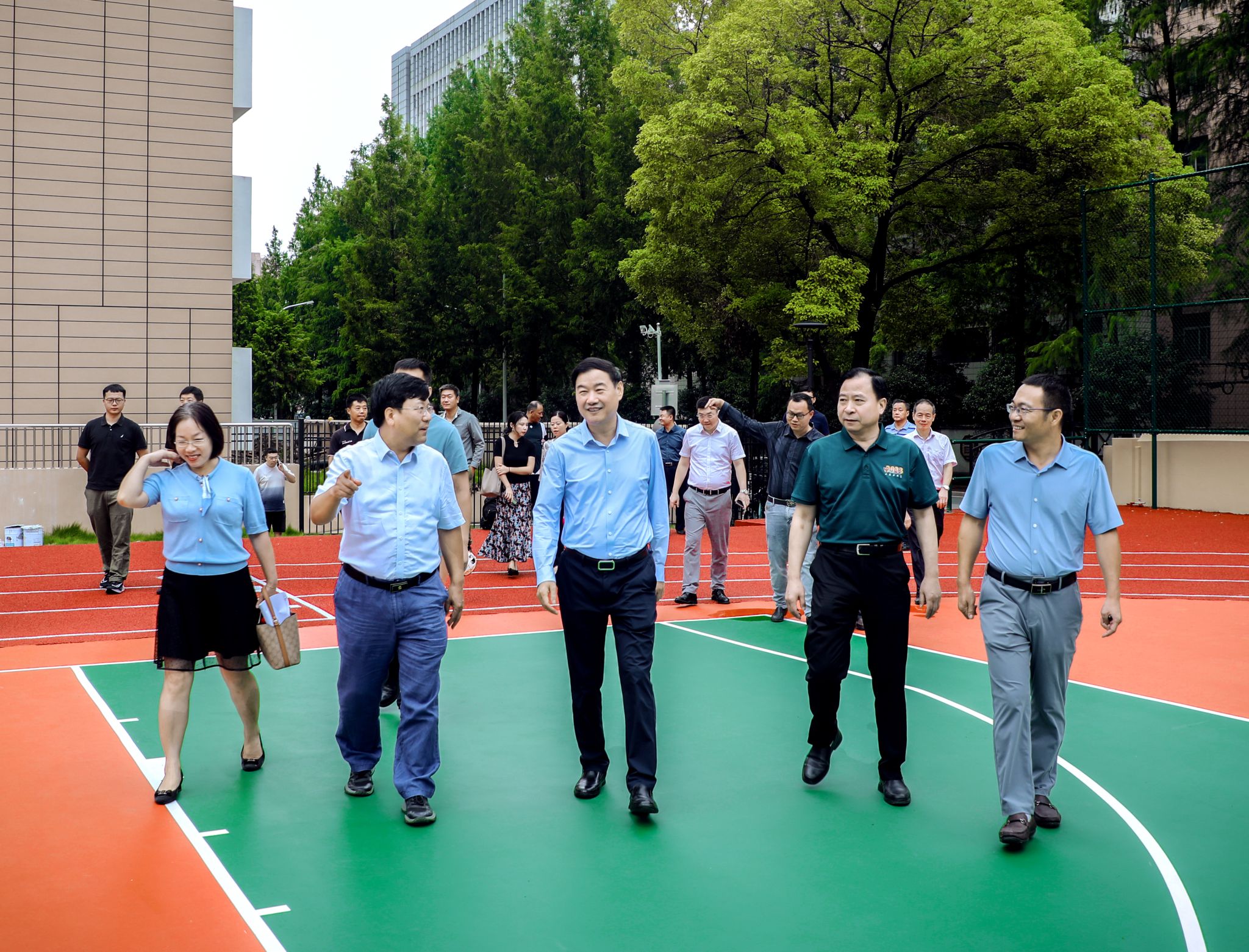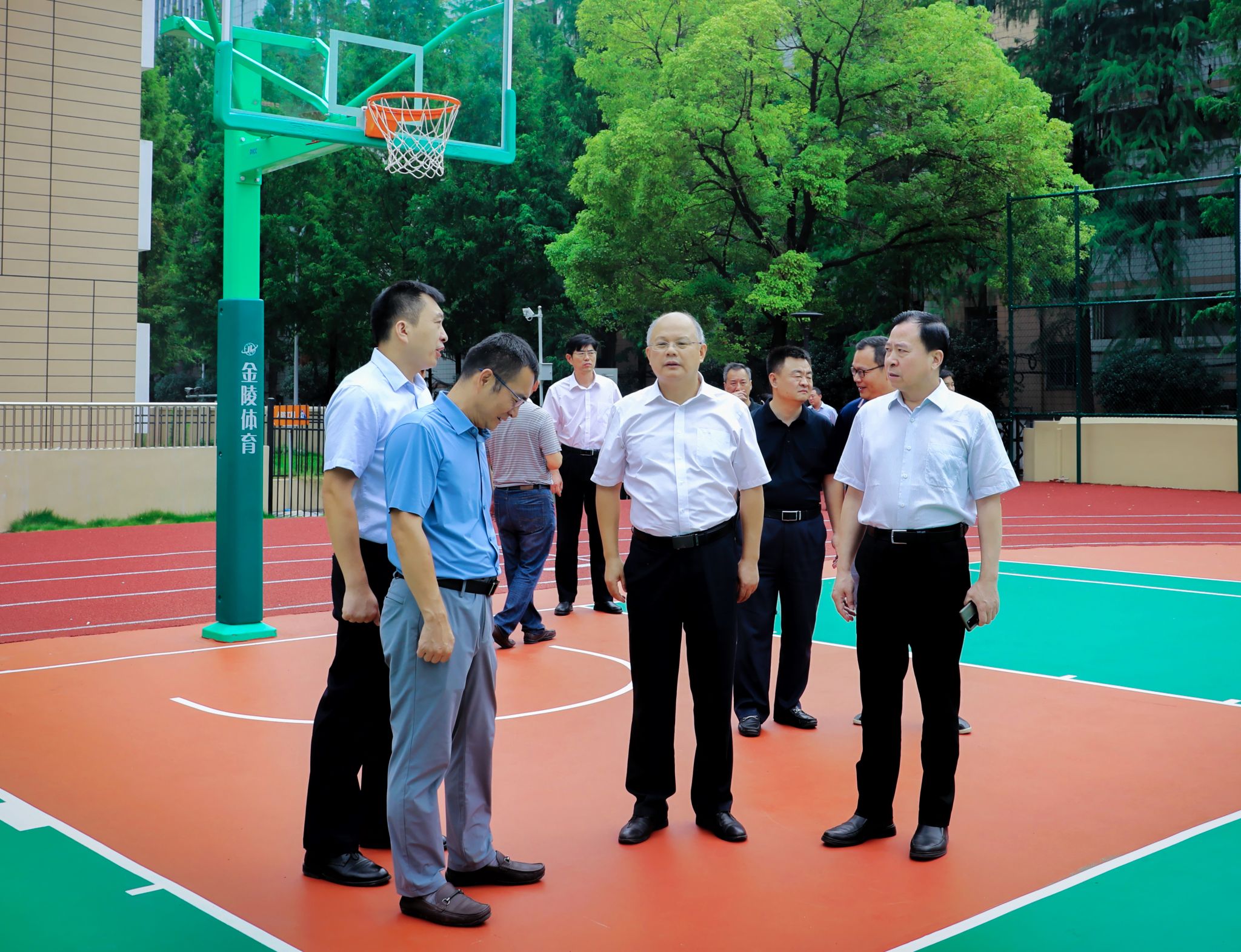 9月2日,校长倪红卫、党委副书记孙国胜现场查看了竣工后运动场的使用情况,听取了校园建设处关于运动场项目施工建设情况汇报,认真询问了材料环保性、功能性和耐用性,对实物观感质量给予了充分肯定,要求学校相关部门做好项目高质量移交和后期日常运行维护工作。