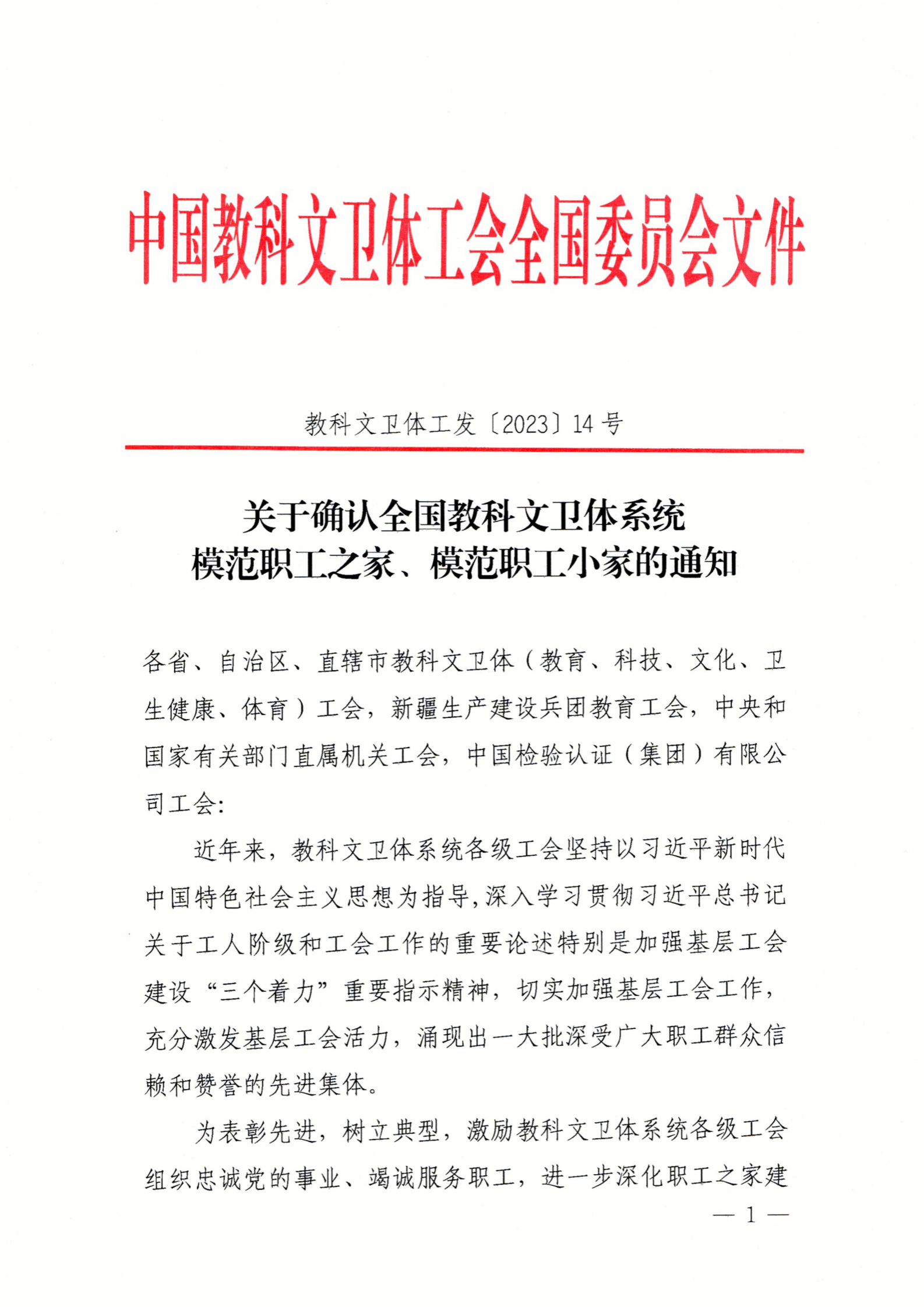 武科大网讯 8月28日,中国教科文卫体工会全国委员会印发了《关于确认全国教科文卫体系统模范职工之家、模范职工小家的通知》(教科文卫体工发〔2023 〕14号),365完美工会获批全国教科文卫体系统模范职工之家。