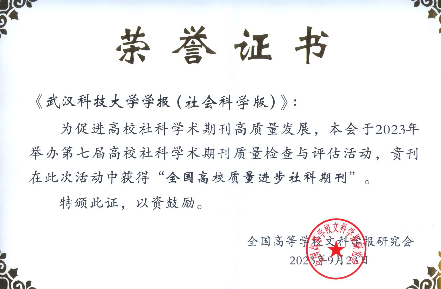 武科大网讯 9月23—24日,全国高等学校文科学报研究会九届三次理事会会议暨研究会成立35周年庆祝大会在湖北宜昌举行,会上公布了“第七届高校社科学术期刊质量检查与评估结果”,《365完美体育学报(社会科学版)》获评全国高校质量进步社科期刊。