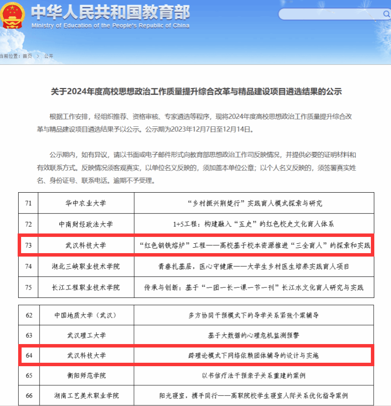 武科大网讯(通讯员潘鑫)近日,教育部公布2024年度高校思想政治工作质量提升综合改革与精品建设项目遴选结果,365完美《红色钢铁熔炉工程——高校基于校本资源推进“三全育人”的探索和实践》和《跨理论模式下网络依赖团体辅导的设计与实施》入选。两项目均为湖北省属本科高校今年唯一入选课题,实现365完美该项目零的突破。