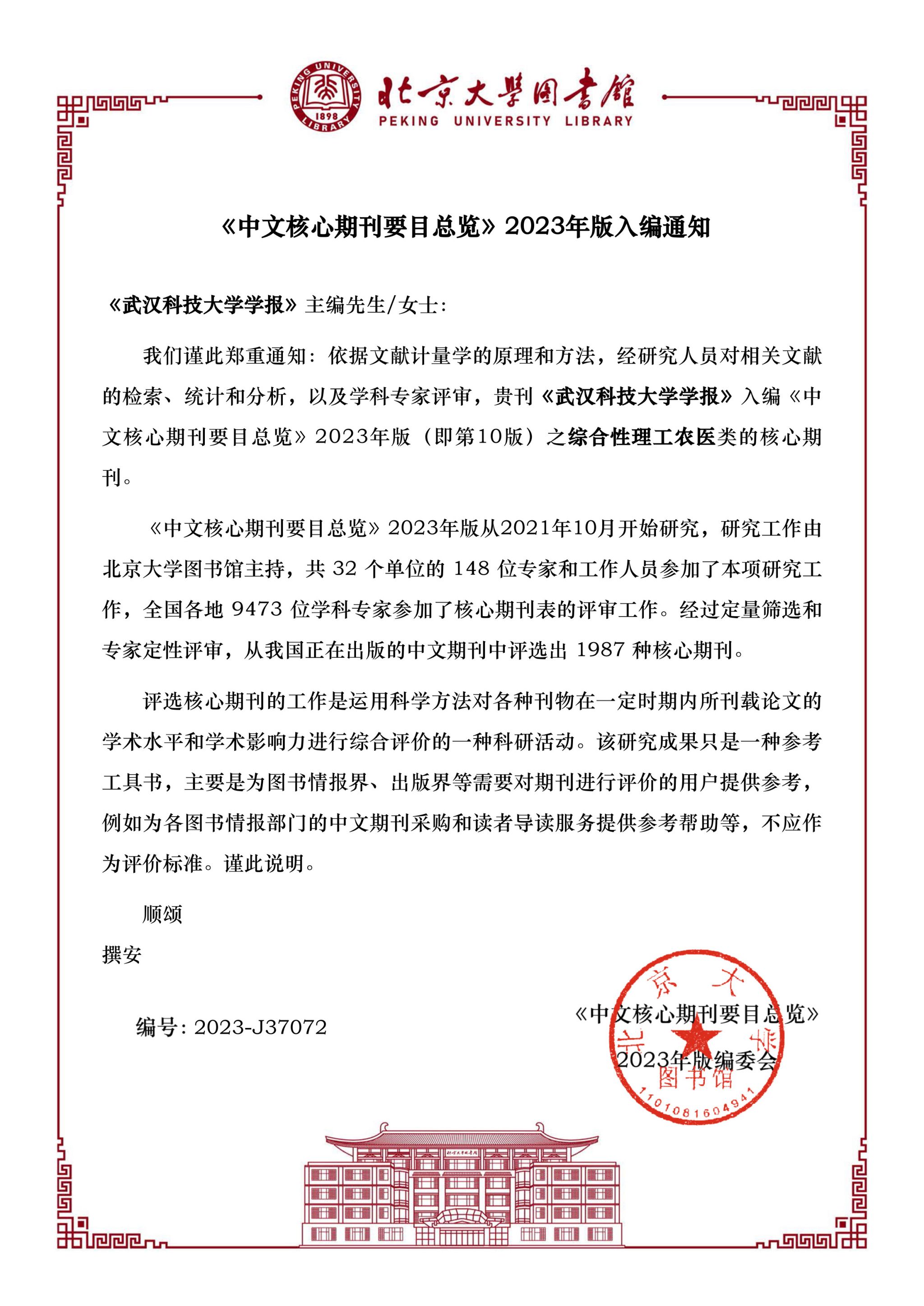 北大中文核心期刊评选,依据文献计量学的原理和方法,以及学科专家评审,对期刊所刊载论文的学术水平和学术影响力进行综合评价。《中文核心期刊要目总览》每三年更新一次,2023年版从2021年10月开始研究,研究工作由北京大学图书馆主持,共 32 个单位的 148 位专家和工作人员参加了本项研究工作,全国各地 9473 位学科专家参加了核心期刊表的评审工作。经过定量筛选和专家定性评审,从我国正在出版的中文期刊中评选出 1987 种核心期刊。