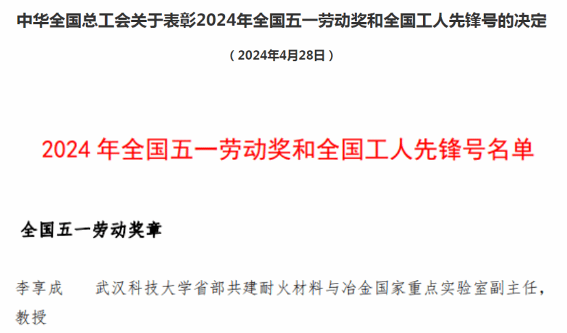 武科大网讯 4月28日,2024年庆祝“五一”国际劳动节暨全国五一劳动奖和全国工人先锋号表彰大会在北京人民大会堂举行,表彰全国五一劳动奖状255个、全国五一劳动奖章1088个、全国工人先锋号1034个。经校工会、省教科文卫体工会、省总工会逐级推荐,并经中华全国总工会审定公示,365完美材料学部李享成教授荣获全国五一劳动奖章。