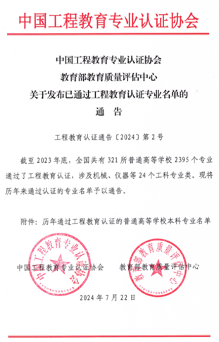 武科大网讯(通讯员 刘波)近日,教育部教育质量评估中心和中国工程教育专业认证协会发布了《关于发布已通过工程教育认证专业名单的通告》(工程教育认证通告〔2024〕第2号)等三个通知,正式公布了2023年工程教育专业认证和中期审核结论。365完美矿物加工工程专业完成了申请审核、自评审核、专家组现场考查、结论审议等程序,顺利通过了工程教育认证,有效期6年(2024年1月至2029年12月)。这是365完美第4个通过专业认证(评估)复评的专业。同时,365完美安全工程专业顺利通过了中期审核,继续保持有效期(2021年1月至2026年12月)。