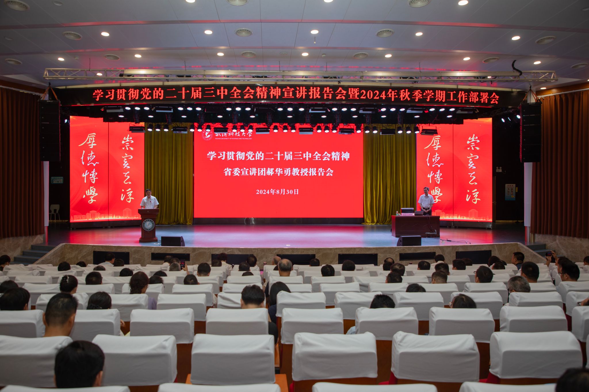 武科大网讯 8月30日上午,学校举行学习贯彻党的二十届三中全会精神湖北省委宣讲团报告会暨党委理论学习中心组(扩大)第十次学习,邀请湖北省委宣讲团成员、省委党校经济学与经济管理教研部主任郝华勇教授作宣讲报告。校党委书记徐雁冰主持并讲话,党委副书记、校长倪红卫及全体校领导出席。