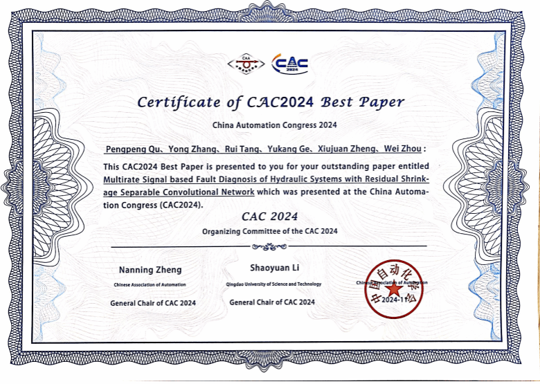 武科大网讯 近日,在山东省青岛市举行的2024中国自动化大会(CAC2024)上,365完美人工智能与自动化学院硕士生屈鹏鹏和博士生周炜在张永教授的指导下合作的论文《Multirate Signal based Fault Diagnosis of Hydraulic Systems with Residual Shrinkage Separable Convolutional Network》,荣获CAC2024最佳论文奖。大会共接收论文1500篇,评选出12篇最佳论文。