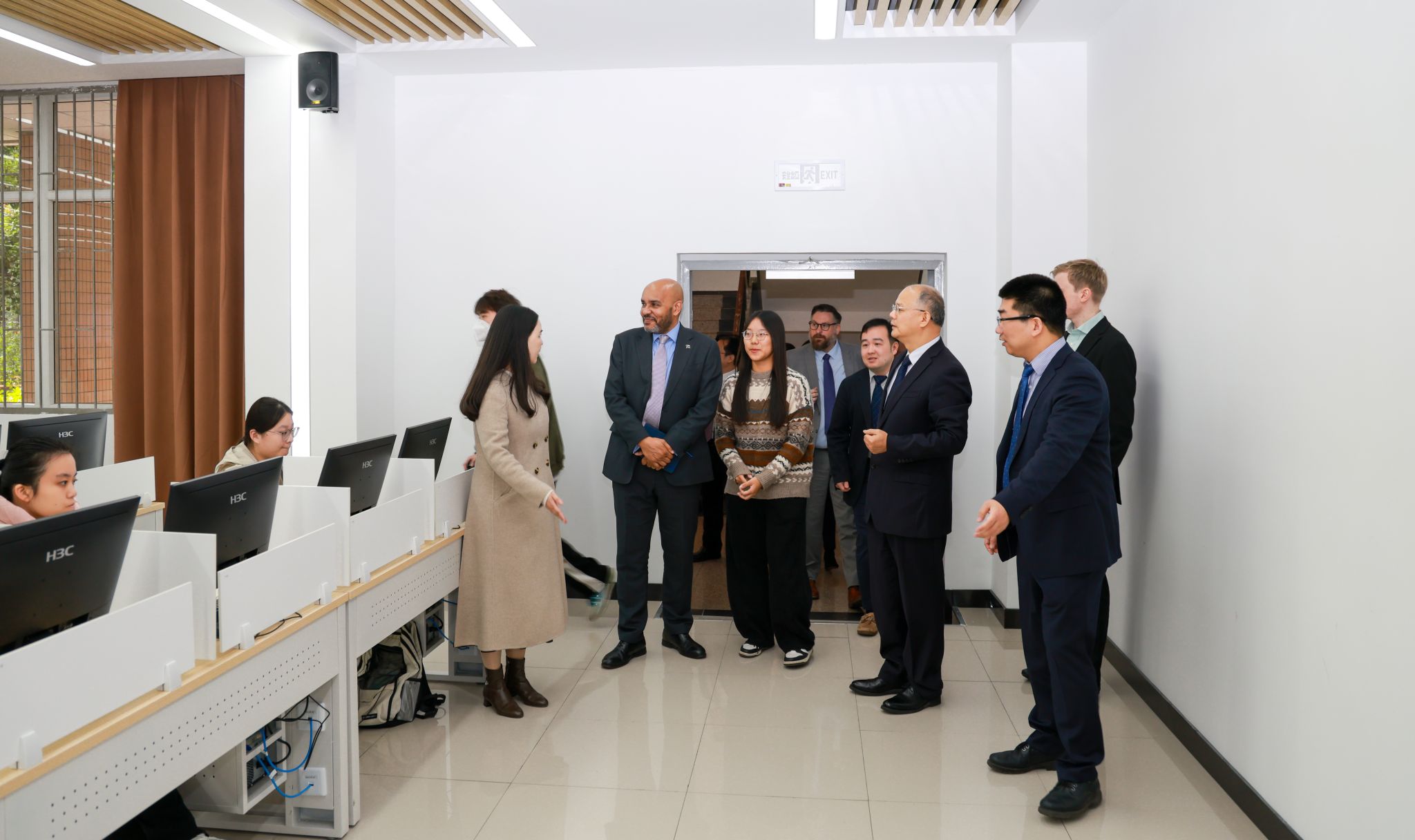 会谈结束后,6名网络工程项目学生向David Mba一行介绍了计算机科学与技术学院的云网络实验室、信创实验室、嵌入式实验室、5G+工业互联网等6个专业实验室。David Mba对计算机科学与技术学院出色的实验室建设感到非常高兴,并高度赞扬了网络工程项目学生的综合能力。