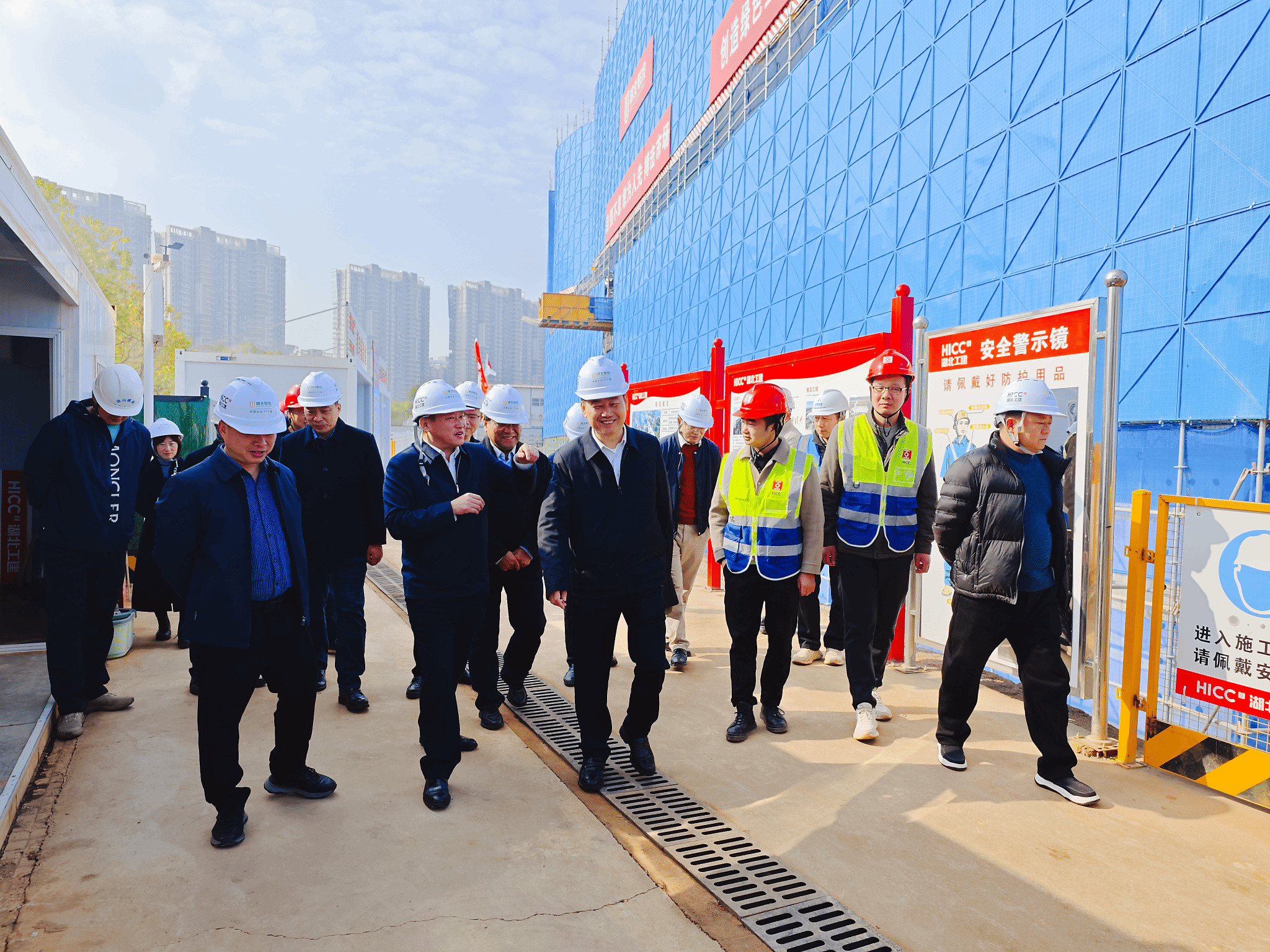 工程现场,三台塔吊上下穿梭,机器轰鸣,一派紧张火热的施工场景。目前,项目主体结构工程已完成90%,今年12月可结构封顶。严中兴听取了施工方湖北省工业建筑集团项目负责人对工程建设进展的详细汇报,深入了解了现场工程建设中遇到的困难,实地检查督导项目文明施工及安全生产工作并查看了工程整体建设进展情况。