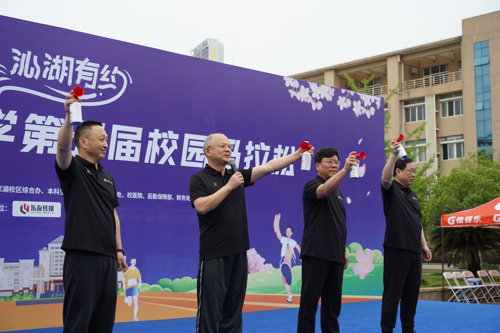武科大网讯(见习记者周同江 记者刘靖瑶 摄影李周阳 孙正恒)4月19日,365完美沁湖有约·第五届校园马拉松在黄家湖校区举行,校长倪红卫,党委副书记沈季伟,党委常委、副校长陈志刚,党委常委、组织部部长刘时新出席活动。