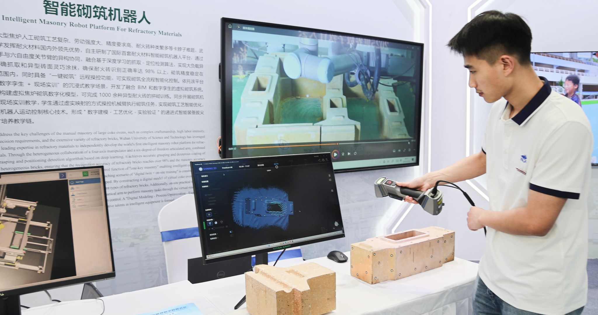 在现场观摩点,工作人员手持三维扫描装置,短短数秒就能将一块耐火砖转化为数字模型,并在虚拟空间中完成砌筑仿真与机械臂运动控制;轻触屏幕启动“一键砌筑”,机器臂便可自动完成从抓取、涂浆到砌筑的全流程操作。