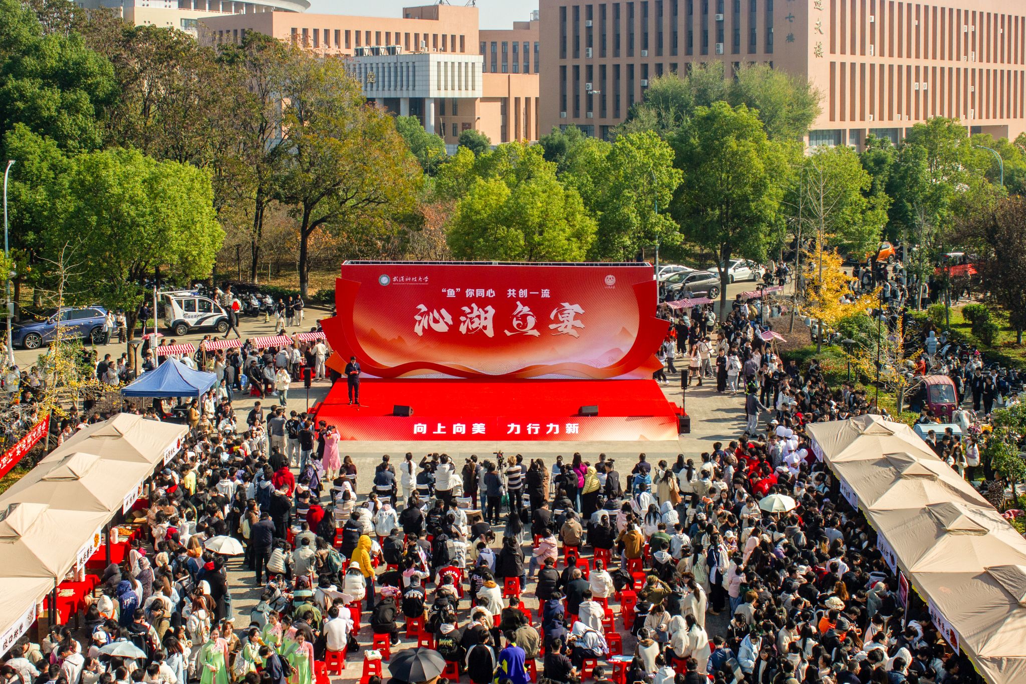 上午十一点半,南园餐厅广场已是人潮涌动,香气弥漫。校长吕勇宣布第十一届沁湖鱼宴开幕,并为“捕鱼王”颁奖。校党委副书记沈季伟在开幕式上致辞,他表示,今年的鱼宴以“鱼你同心 共创一流”为主题,这既是文化传承的基因密码,也是全体武科大人勇攀一流高峰的共同追求。他祝愿大家“年年有鱼,岁岁欢歌!”