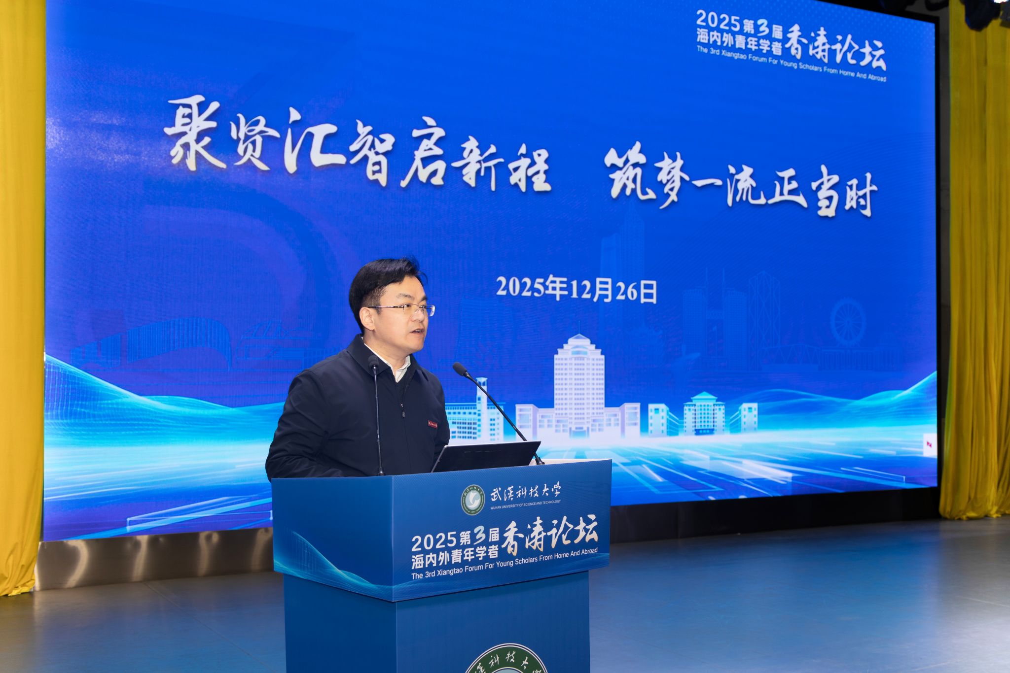 武科大网讯(记者余蔓菲)12月26日上午,学校在青山校区碧园会堂举办第3届海内外青年学者香涛论坛。湖北省委组织部人才工作处副处长王闯,校党委书记倪红卫,校党委副书记、校长吕勇,党委常委、副校长马腾出席会议。来自海内外的数百位青年学者以线上+线下的方式参加会议。会议由马腾主持。