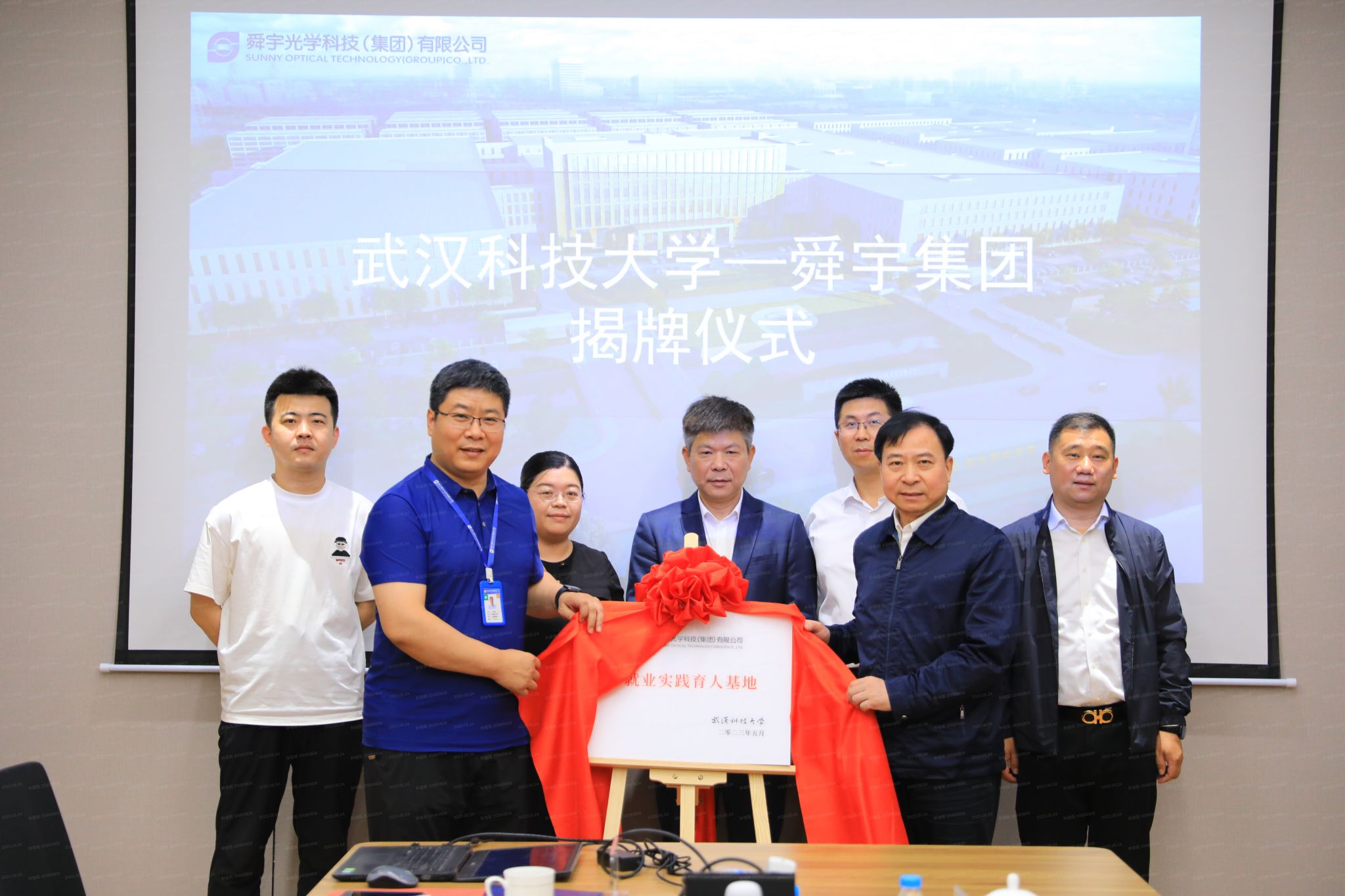 双方举行“就业实践育人基地”揭牌仪式。座谈前,孙国胜一行参观了舜宇集团展厅。