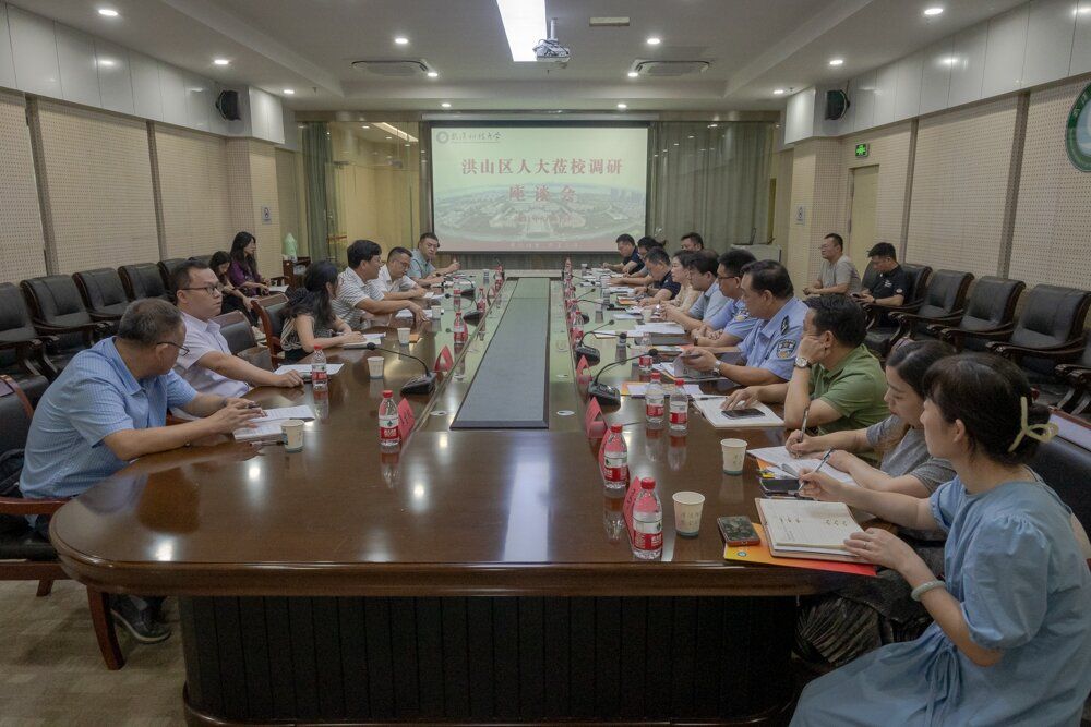 洪山区人大城环委主任委员赵扬、城管执法局执法大队大队长杨峻、交通大队副大队长胡连军、交通大队三中队队长孙军、教育局规划科科长梅进诚、人大常委会办公室老干部科科长李树波、文化和旅游局体育事业科科长卓瑛、园林局公园管理中心主任左聪,青菱街道四级调研员杨建槐、公共服务办公室主任秦盛华、黄家湖社区书记马丽君,学校学工处副处长龚晗、团委副书记向方新、校园建设处副处长林森、保卫处副处长舒国谋、后勤保障部副部长吴宝权参加会议。