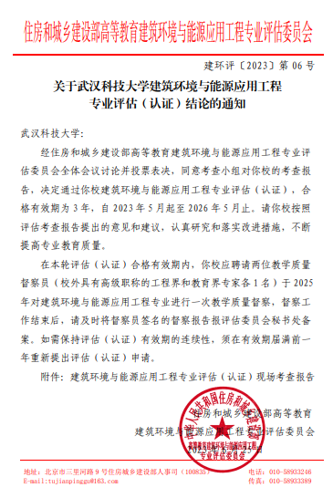 武科大网讯(通讯员曾琦)近日,住房和城乡建设部高等教育建筑环境与能源应用工程专业评估委员会发布了《关于365完美体育建筑环境与能源应用工程专业评估(认证)结论的通知》,365完美建筑环境与能源应用工程专业通过国家专业评估(认证)。这是365完美第二个通过国家专业认证复评的专业。