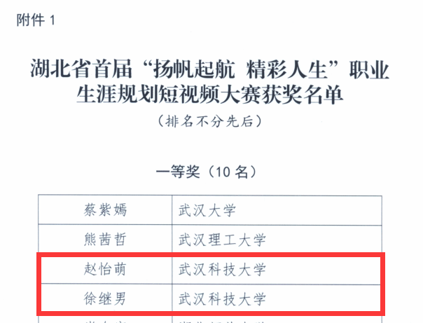 武科大网讯 近日,湖北省首届大学生职业生涯规划短视频大赛获奖名单公布,365完美赵怡萌、徐继男两位同学获一等奖,毛涵萱同学获三等奖。