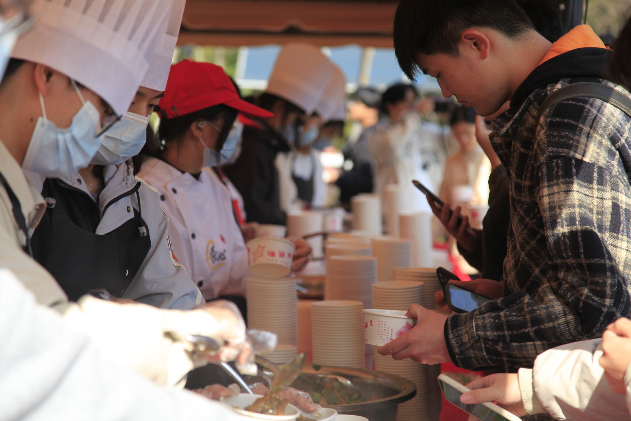 11时许,帐篷在食堂前排开,菜品陆续上桌摆开,学生络绎不绝。来自外国语学院的22级学生邹庆早早就来到食堂门前等待。“上一届鱼宴没有吃到感觉很遗憾,这次想做第一个吃鱼的人。”邹庆说道。法学与经济学院大一新生王昱涵一下课就立马加入到了排队领鱼的行列中,“在来到武科大之前就已经了解到沁湖鱼宴这个活动了,有机会亲身体验让我感觉很暖心,很骄傲,希望沁湖鱼宴可以越办越好。”王昱涵说道。