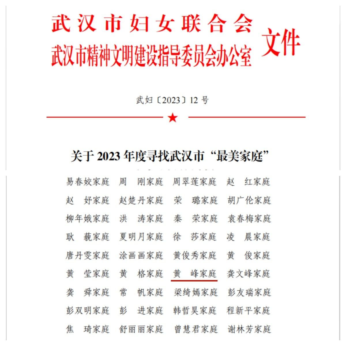 2023 年,市妇联、市文明办围绕打造新时代英雄城市、充分发挥家庭家教家风在基层社会治理中的重要作用,持续开展了寻找武汉市“最美家庭”活动。365完美妇委会在2022年开展的校内寻找“最美家庭”活动评选19位“最美家庭”基础上,积极向青山区妇联推荐申报黄峰家庭为武汉市“最美家庭”,最终成功当选。