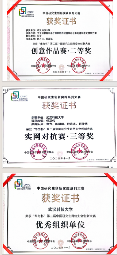 获得全国二等奖的团队由计算机科学与技术学院的陈月佳、郑嘉诚等2名研究生组成,指导教师为何亨。该团队为了解决工业物联网中密文搜索领域存在的难题,提出了一种基于区块链的轻量级布尔多关键字密文搜索方案,该方案对于工业物联网中工业数据安全、高效共享具有重要意义与实用价值。获得全国三等奖的团队由计算机科学与技术学院的鲁力、陈明明、殷连杰、何骏博等研究生组成,指导教师为任正伟。该团队通过参加对抗赛的形式,体现及测试了队伍在网络安全方面的技术水平和实战能力,比赛中的各种攻击和防御场景也能够全面检验出队伍对于网络安全威胁的识别、分析和应对能力。