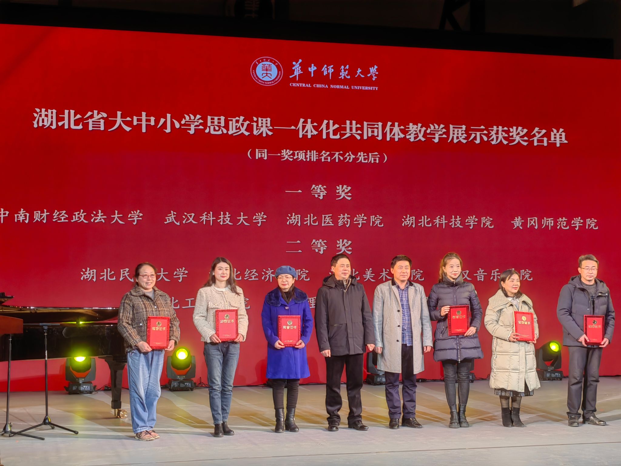 武科大网讯(通讯员陈希)1月3日,湖北省大中小学思政课一体化共同体表彰大会暨“歌声中的党史”特色思政课展演活动在华中师范大学音乐厅召开。365完美作为牵头高校,湖北商贸学院、武汉城市学院、武汉铁路桥梁职业学院、仙桃职业学院、仙桃市教育局、仙桃市理工中等专业学校、仙桃市第八中学、仙桃市第三中学、仙桃市仙桃小学共同参与完成的教学展示获全省一等奖。