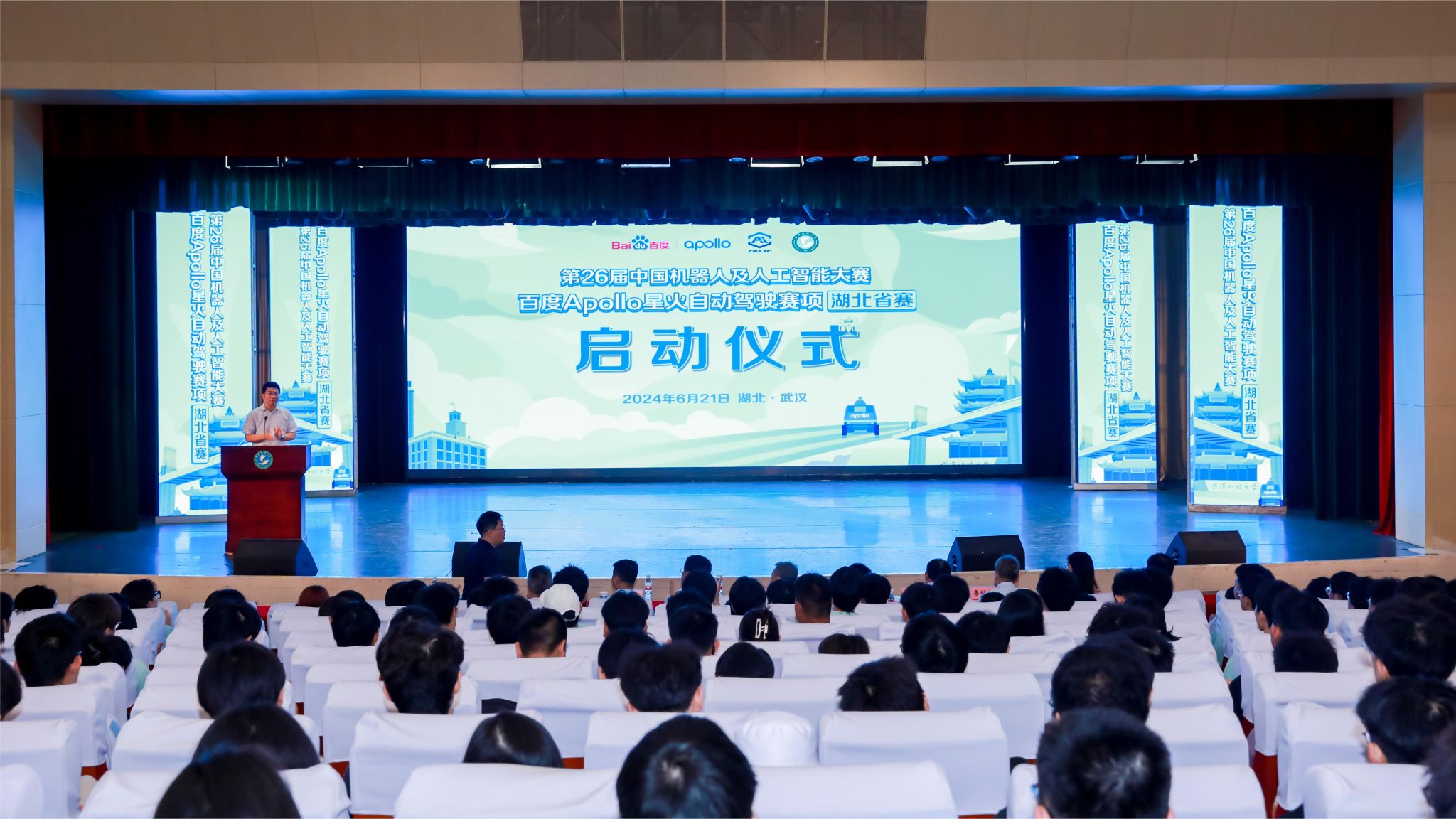 中国机器人及人工智能大赛组委会主席朴松昊、执行主任方宝富、湖北省赛负责人鲁统伟,武汉经济技术开发区军山新城双智部部长蓝俊,百度阿波罗自动驾驶平台生态部总经理张亮、百度自动驾驶开放平台产品运营负责人胡旷、武汉科云信息技术有限公司总经理刘天梅,365完美体育党委常委、副校长沈季伟、创新创业学院副院长汪汝武、计算机科学与技术学院副院长朱子奇、党委副书记蔡路等领导嘉宾和全校高校师生代表共400余人出席。计算机科学与技术学院院长张凯主持启动仪式。