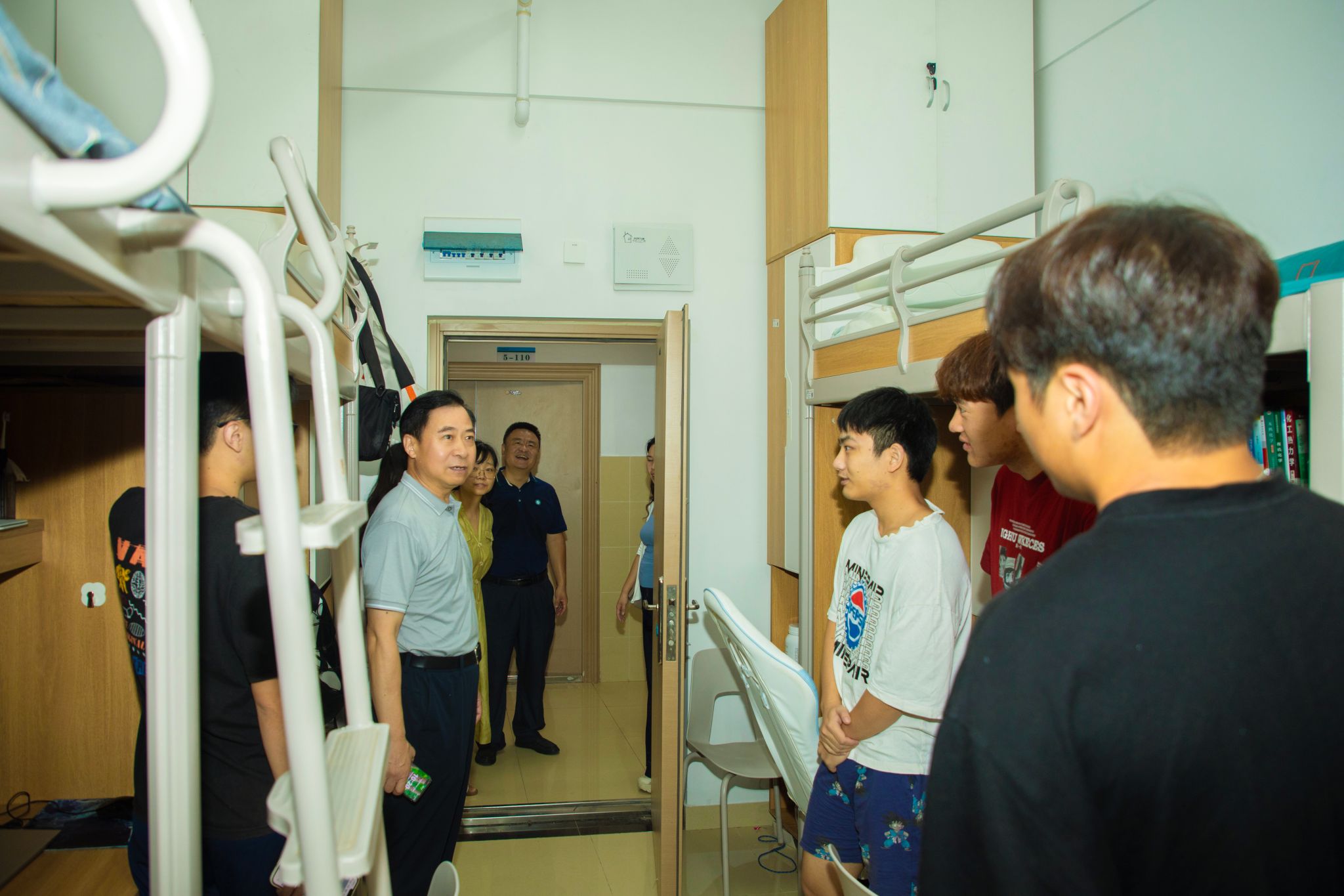 31日上午10点,孙国胜一行走进学生宿舍,与正在整理搬迁物品的学生交流,详细询问他们在校的学习及生活情况,宿舍管理建设的意见和建议以及遇到的困难,细心查看了同学们的床铺、书桌、卫生间等生活设施。