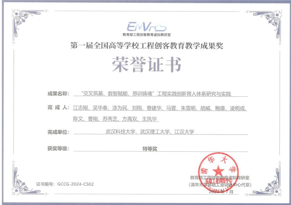 中心是首批湖北省工程训练示范中心和湖北省高等教育协会金工教学专业委员会副理事长单位。中心获首届全国工程创客教育教学成果特等奖1项,省级教学成果二等奖2项、三等奖1项,编写出版实训教材4部,发表教学研究论文40余篇,其中部分论文发表在中文核心及SCI、EI、CPCI检索期刊上,对工程实践与创新教学质量提升和教学手段创新起到了极其重要的推动作用。