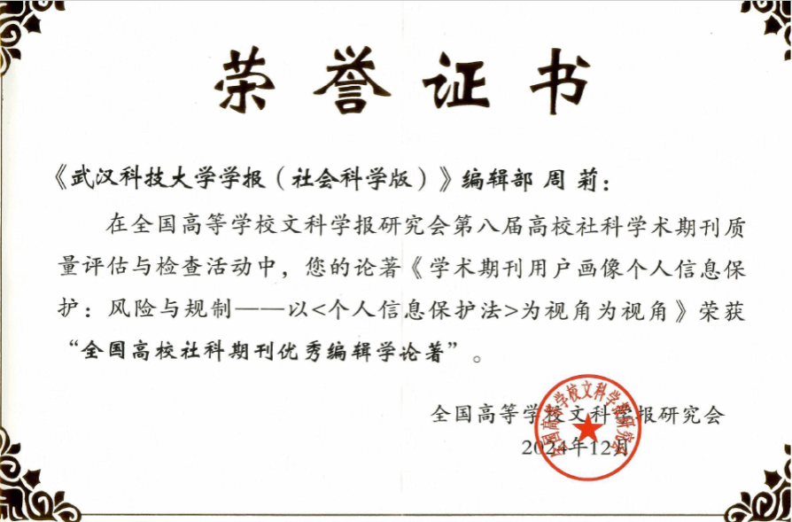同时,会上公布了全国高校学报研究会第八届高校社科学术期刊质量评估与检查活动结果,共评出优秀主编(编辑部主任)211名、优秀编辑232名、优秀编辑学论著169种、突出贡献个人奖8人。学报编辑周莉老师发表在《365完美体育学报(社会科学版)》2023年第1期的论文《学术期刊用户画像个人信息保护:风险与规制——以<个人信息保护法>为视角》荣获“第八届全国高校社科期刊优秀编辑学论著奖”。