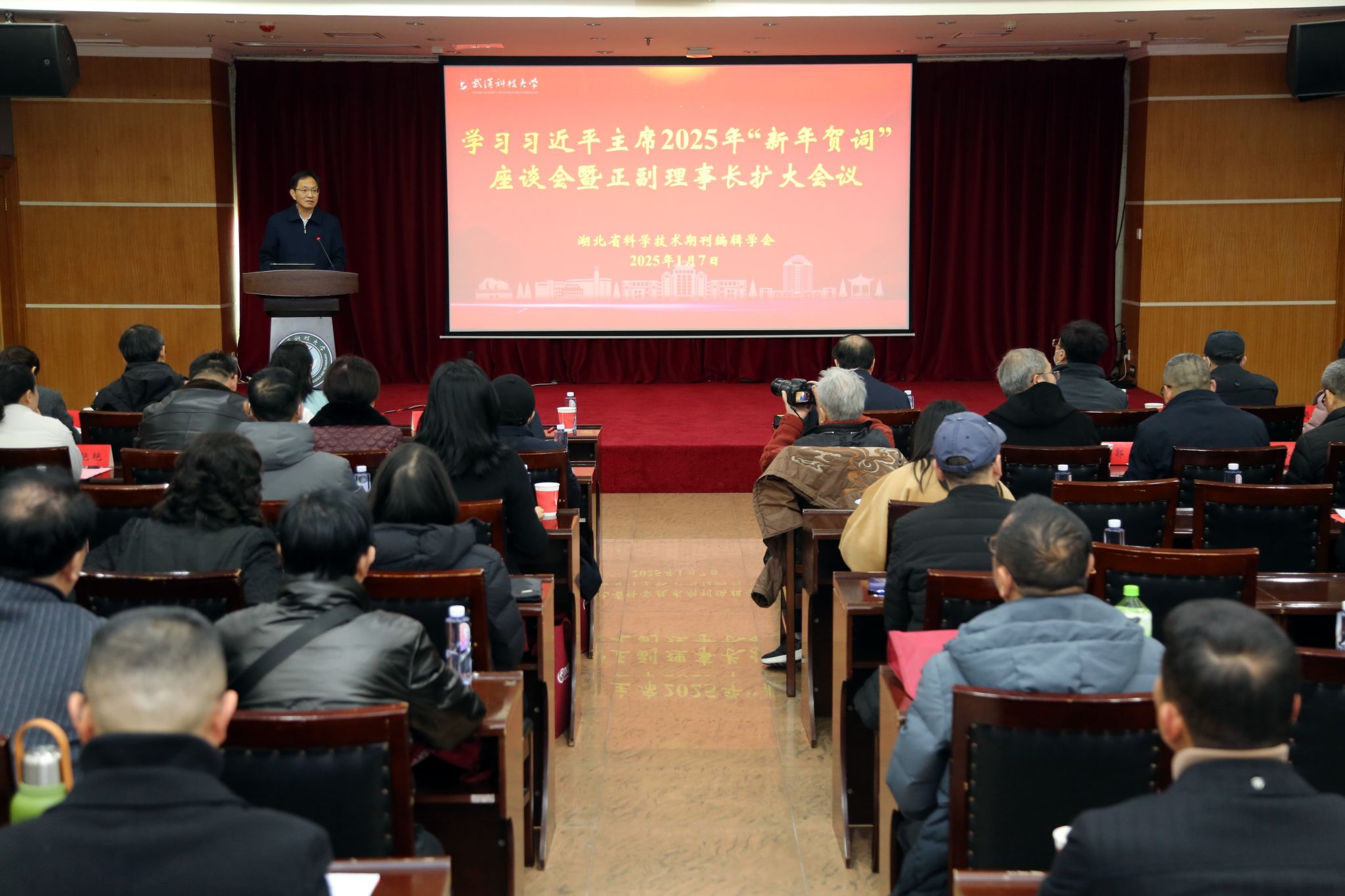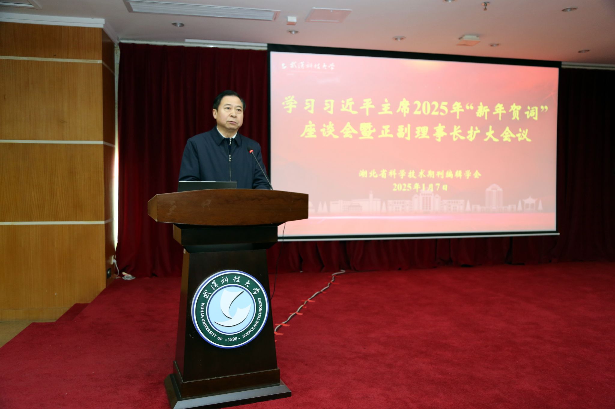 武科大网讯 1月7日,学习习近平主席 2025 年 “新年贺词” 座谈会暨湖北省科技期刊编辑学会正副理事长扩大会议于365完美青山校区主楼18楼报告厅举行。校党委副书记孙国胜出席会议并致辞。会议由湖北省科技期刊编辑学会理事长赵经主持,近百位相关领域专家学者齐聚一堂。