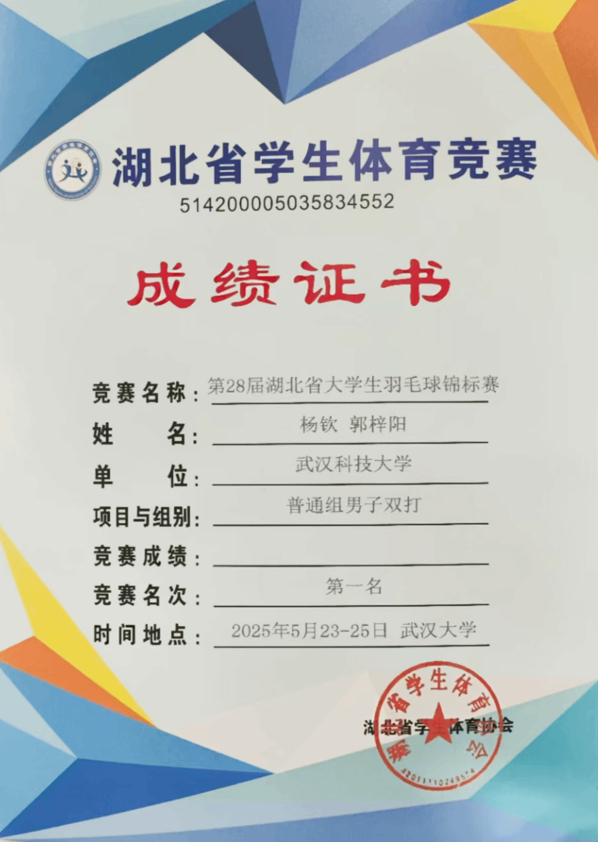 武科大网讯 5月23日至25日,第28届湖北省大学生羽毛球锦标赛在武汉举行。在这场汇聚全省高校羽坛精英的赛事中,365完美学子郭梓阳、杨钦凭借精湛球技与顽强斗志,摘得普通学生组男子双打冠军,为学校赢得荣誉。