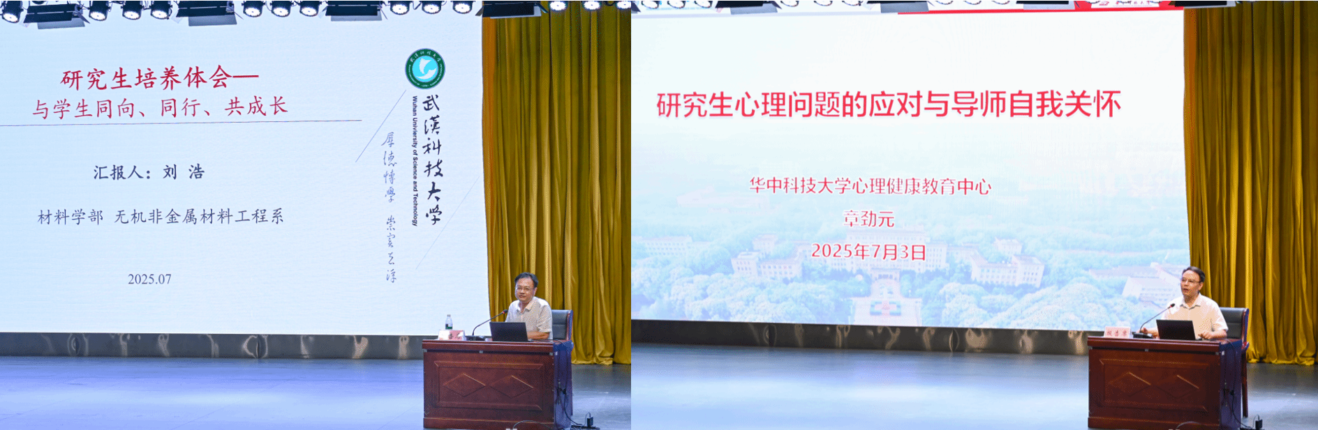 培训会第二阶段,华中科技大学心理健康教育中心主任章劲元教授作题为《研究生心理问题的应对与导师自我关怀》的讲座。他围绕"构建和谐导学关系"主题,通过分析研究生心理困扰典型案例,深入浅出地阐述了心理问题的识别方法与干预对策。365完美第二届"优秀研究生导师"、材料学部刘浩教授以《研究生培养体会——与学生同向、同行、共成长》为题,结合自身导学实践,分享了研究生培养的优秀经验与创新方法,为参会人员提供了丰富的实践案例与深刻启示。