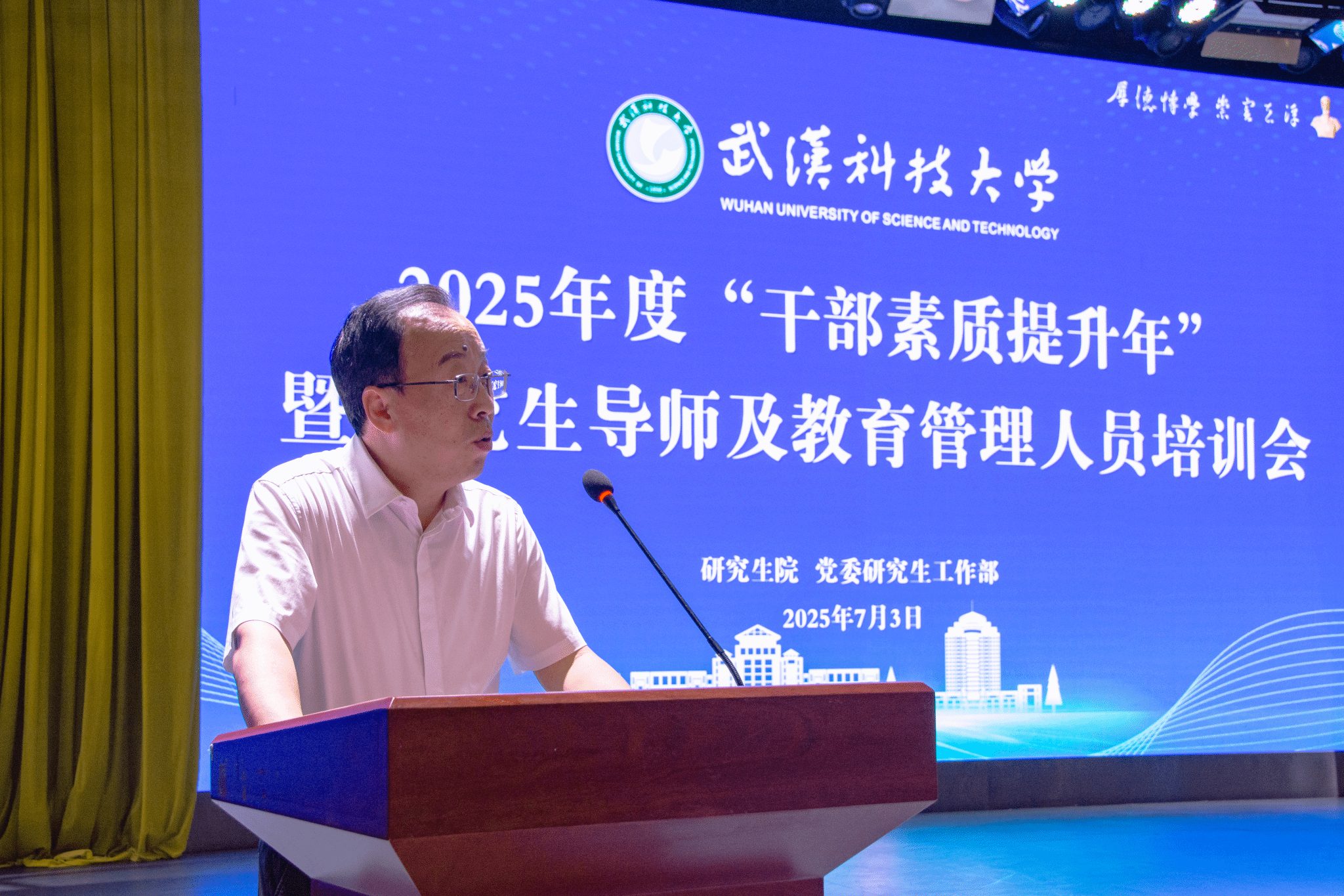 武科大网讯(通讯员朱磊 摄影李周阳 耿文潇)7月3日下午,学校在青山校区碧园会堂召开2025年度"干部素质提升年"暨研究生导师及教育管理人员培训会。党委常委、副校长马腾出席会议。党委研究生工作部部长许辉主持培训会第一阶段,研究生院院长程常桂主持培训会第二阶段。