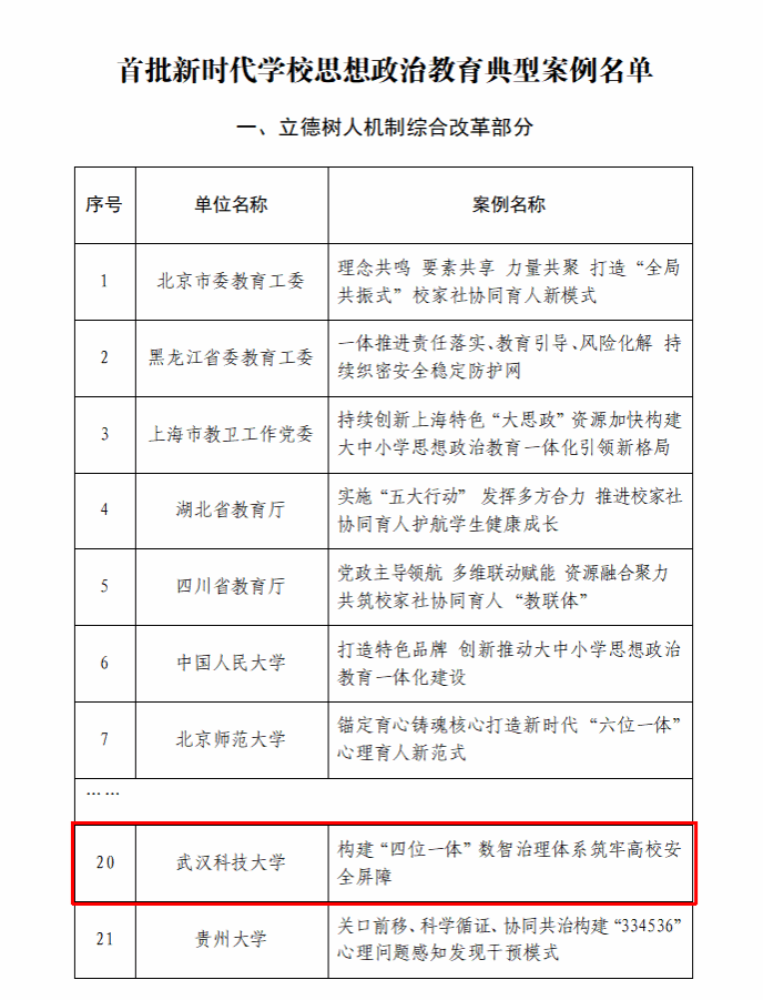 武科大网讯 3月25日,教育部公布首批新时代学校思想政治教育典型案例。首批100个典型案例对标新时代立德树人工程布局,包括立德树人机制综合改革、党的创新理论主课堂、新时代伟大变革实践育人大课堂、数字时代网络育人新课堂、教师队伍和基层组织建设等5大部分。365完美湖北省高校网络舆情分析研究中心和湖北省人文社科重点研究基地“舆情研究中心”报送的案例《构建“四位一体”数智治理体系 筑牢高校安全屏障》成功入选。该案例也是湖北省属本科高校唯一入选案例。