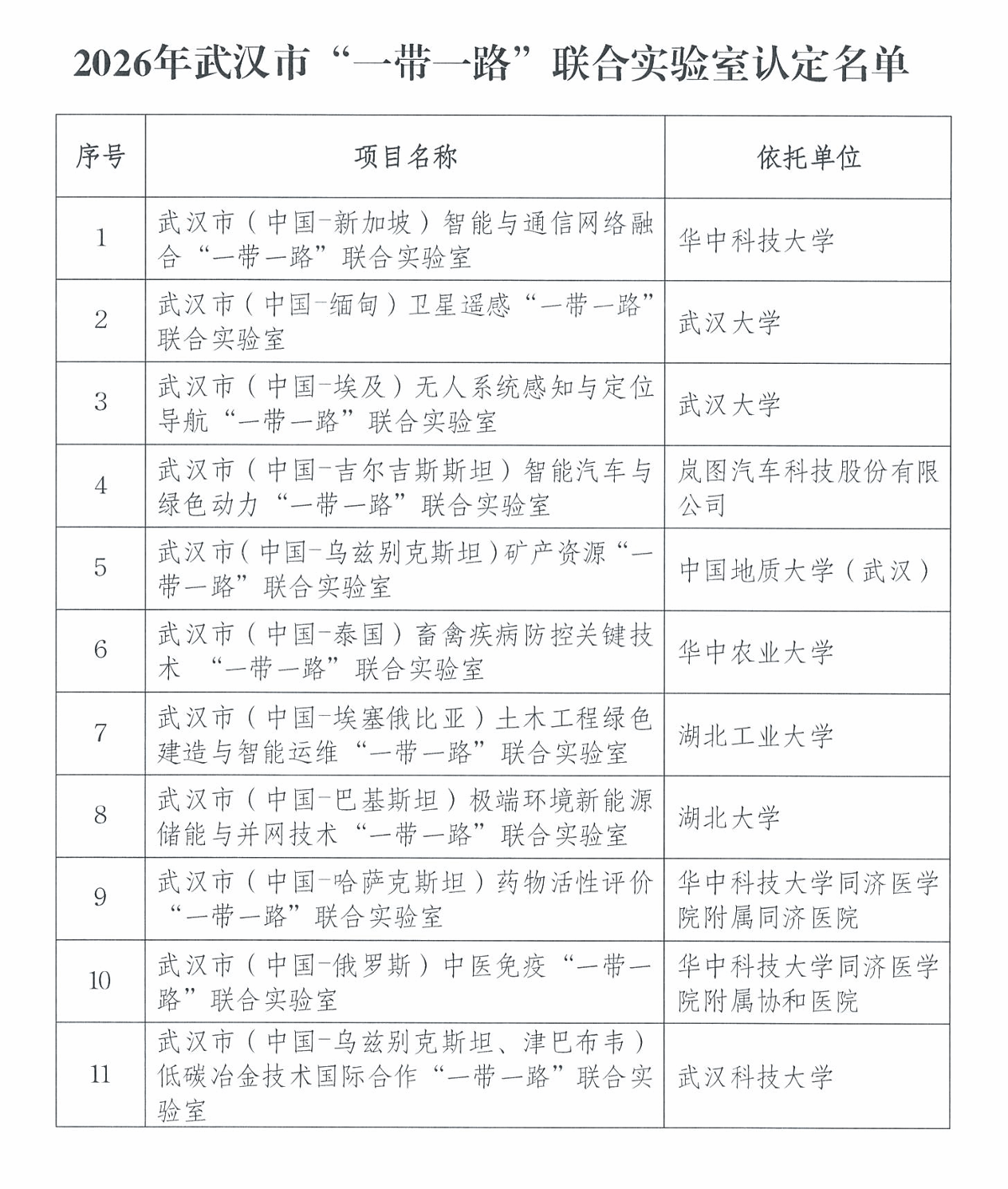 据悉,为支持在汉高校院所、领军企业与“一带一路”沿线国家高水平大学共建联合实验室,汇聚全球创新资源,武汉市科技创新局于今年1月启动新一轮市“一带一路”联合实验室认定工作。经单位申报、专家推荐等程序共认定5个武汉市国际企业创新中心、17个“一带一路”联合实验室和8个外资(企业)研发中心。