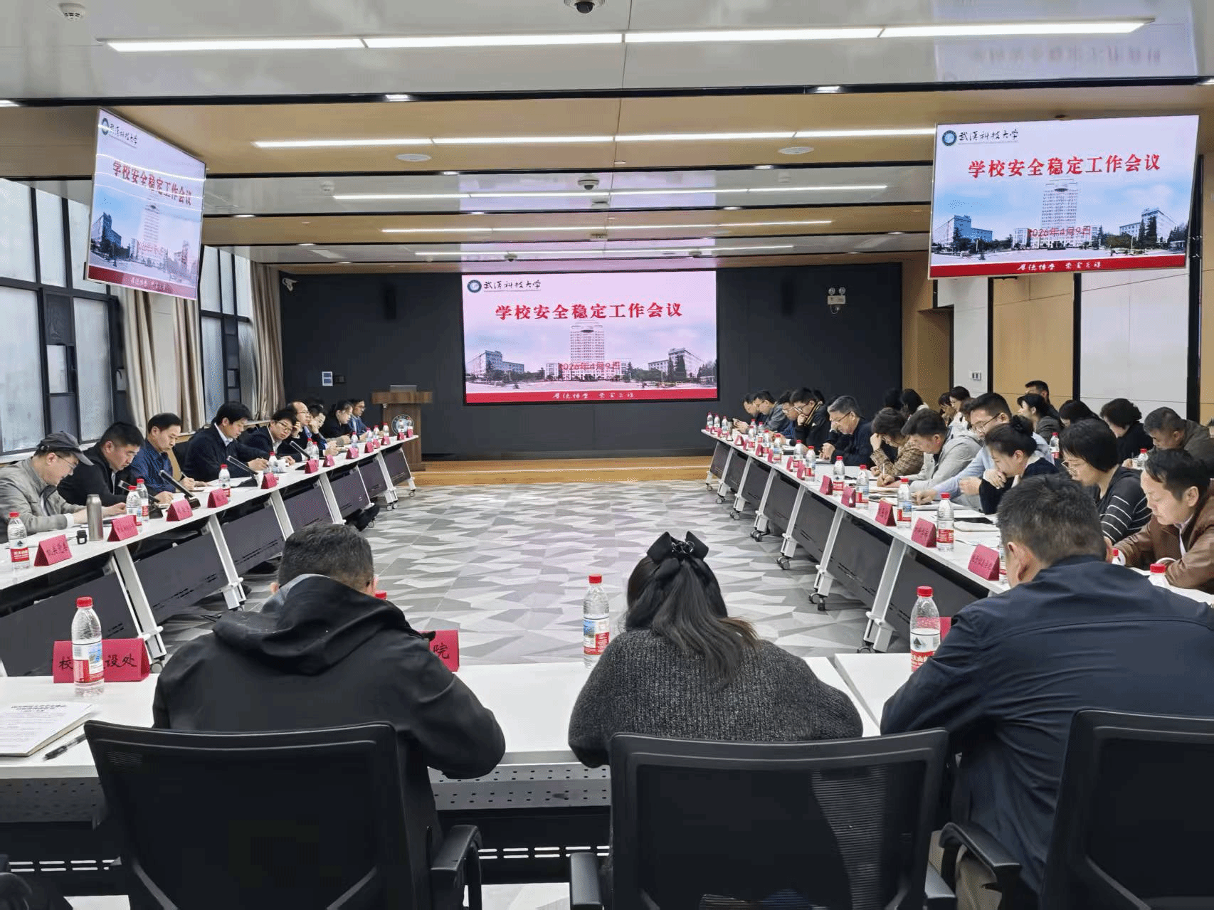 武科大网讯(通讯员黄世军)4月9日上午,学校在青山校区图书馆一楼路演厅召开2026年第一次全校安全稳定工作会议。校党委副书记孙国胜主持会议并讲话。学校安全工作委员会成员单位负责人、各二级单位安全责任人、保卫处有关工作人员参会。