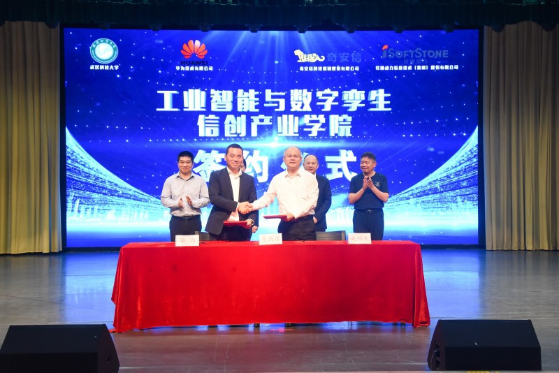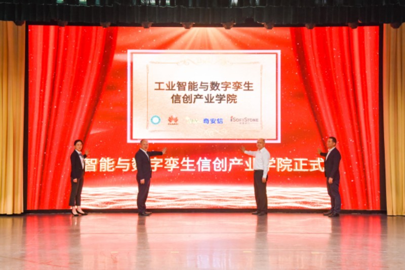 会上,倪红卫分别与华为、奇安信、软通动力签署了产业学院合作协议,并共同为工业智能与数字孪生信创产业学院揭牌。