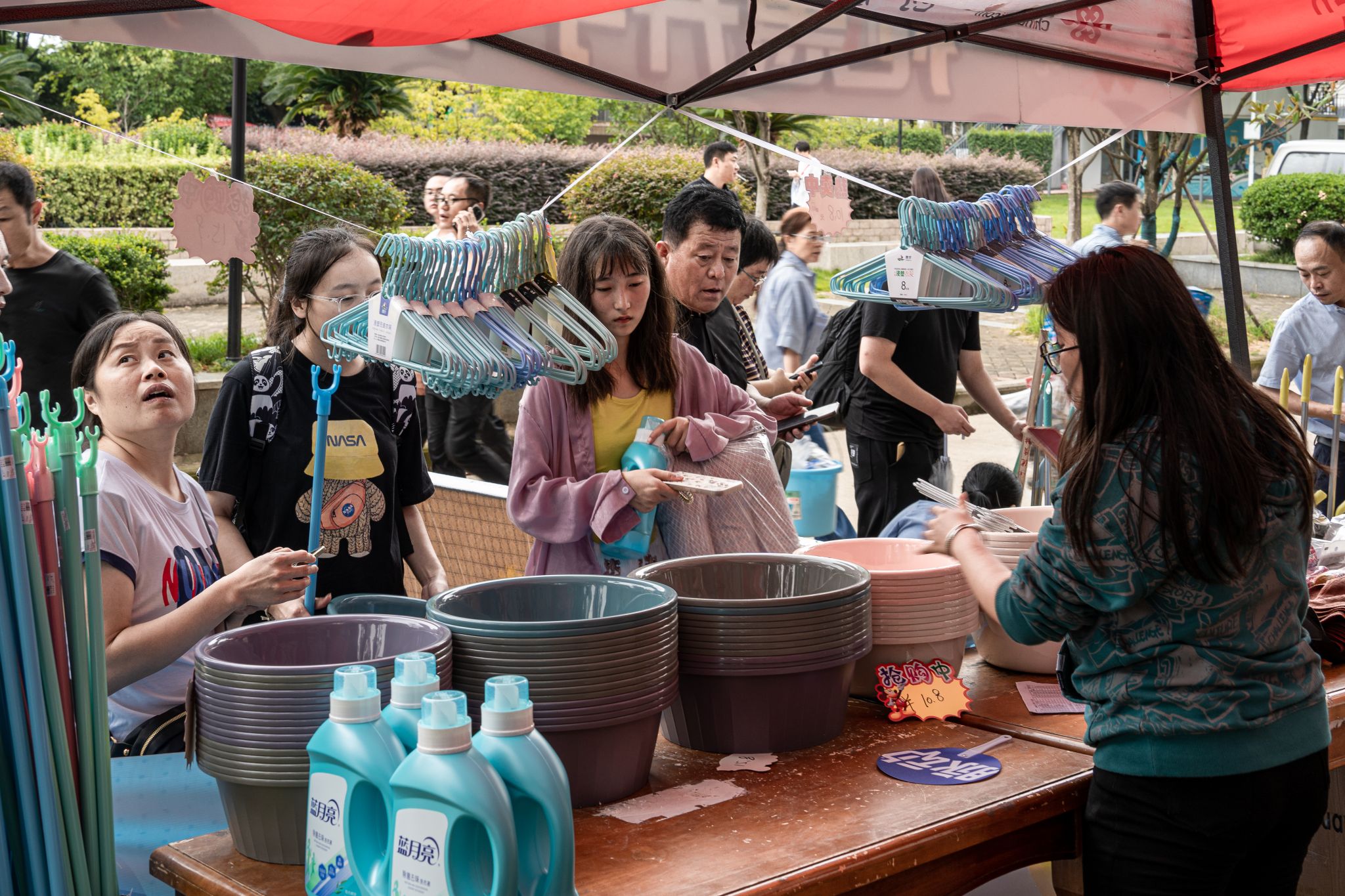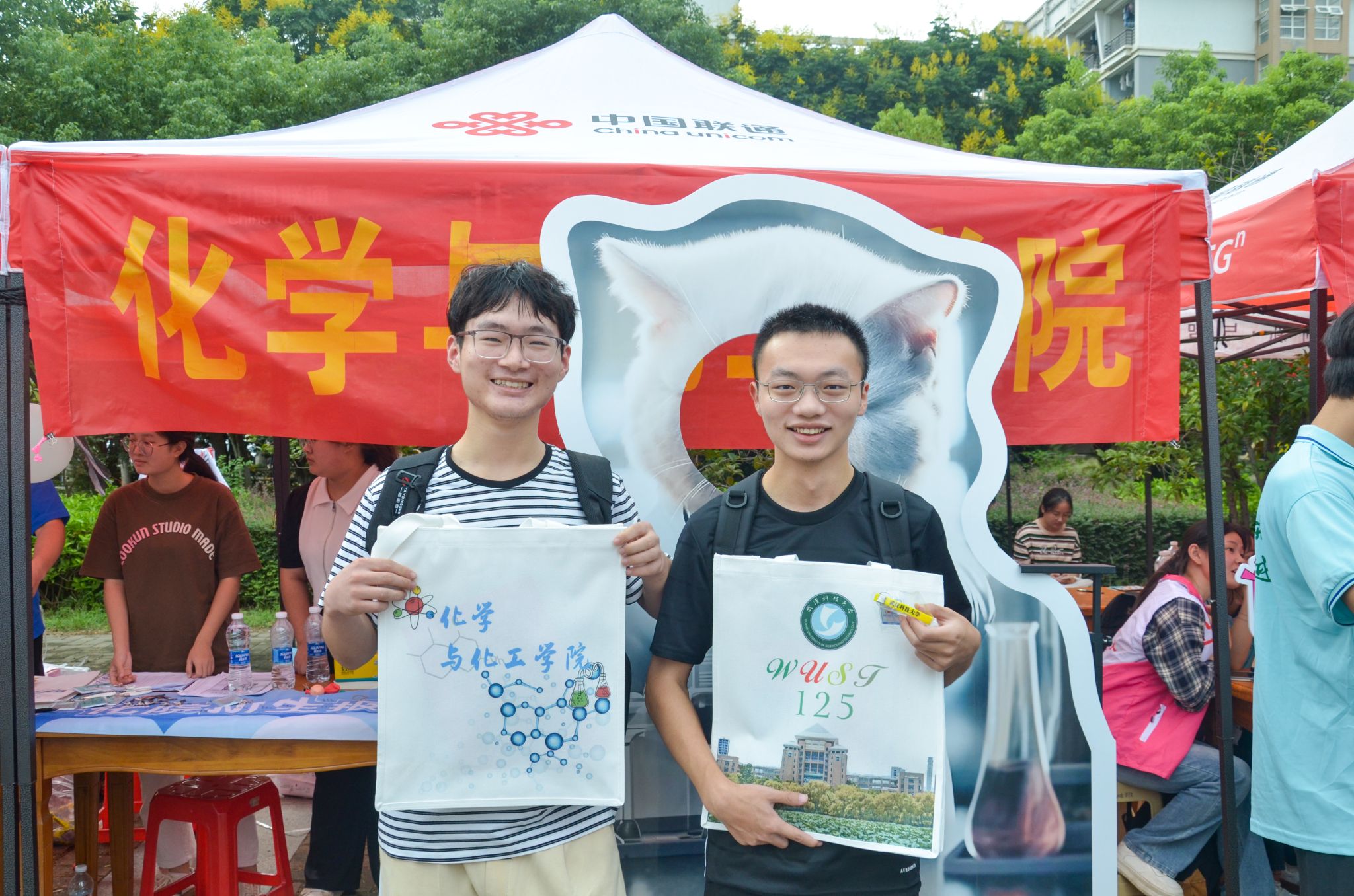 材料学部新生手拿文创产品与志愿者合影 吴磊摄