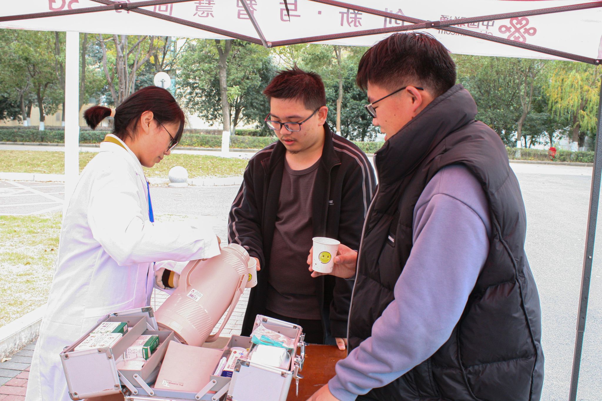 志愿者倒水 杜玉欣摄