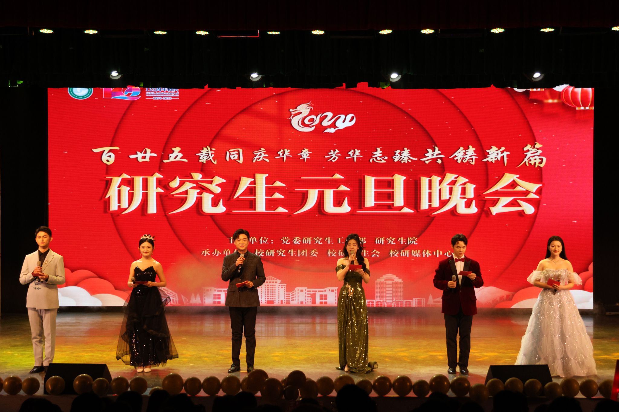 12月27日晚,2022-2023学年研究生学风建设表彰大会暨2024年研究生元旦晚会在黄家湖校区沁湖礼堂举行。党委常委、副校长马腾、党委研工部部长冒颖、研究生院院长程常桂、黄家湖综合办公室主任赵凯、党委学生工作部副部长龚晗、研究生院副院长冯涛、研究生院研招办主任秦茂林、校团委副书记向方新,学校相关职能部门负责人、各学院领导、辅导员以及研究生代表出席活动。2024年研究生元旦晚会由彭九九、刘兆天、申博源、贾喻圆、郭锐琦、戴雨薇六位同学主持。