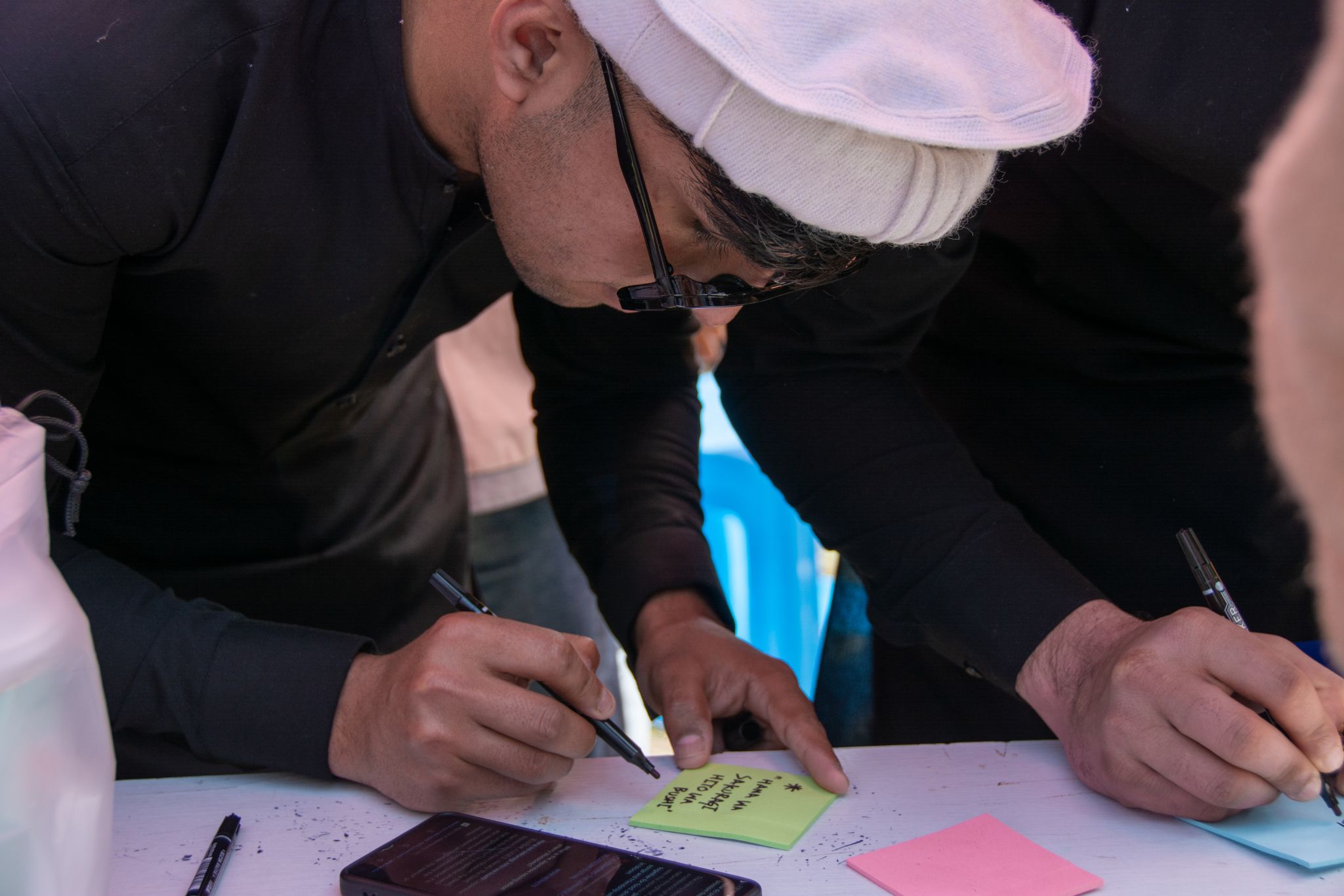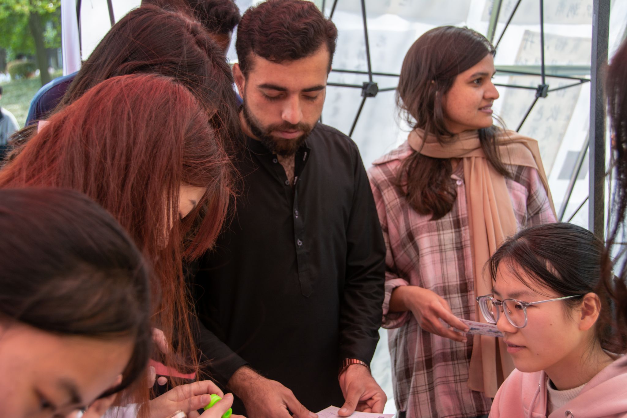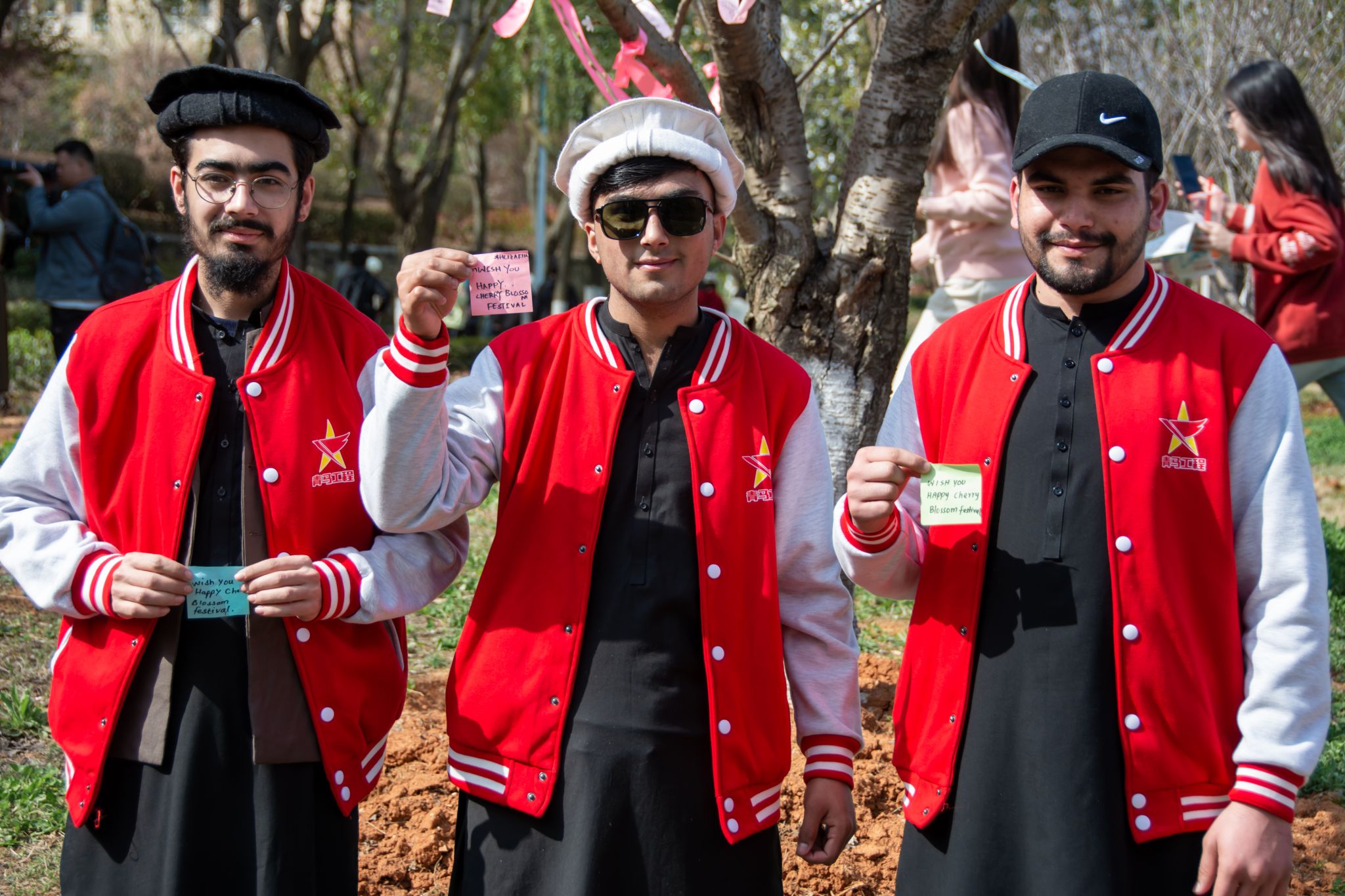 留学生穿中华传统服饰在打卡墙前合影 江子琪摄