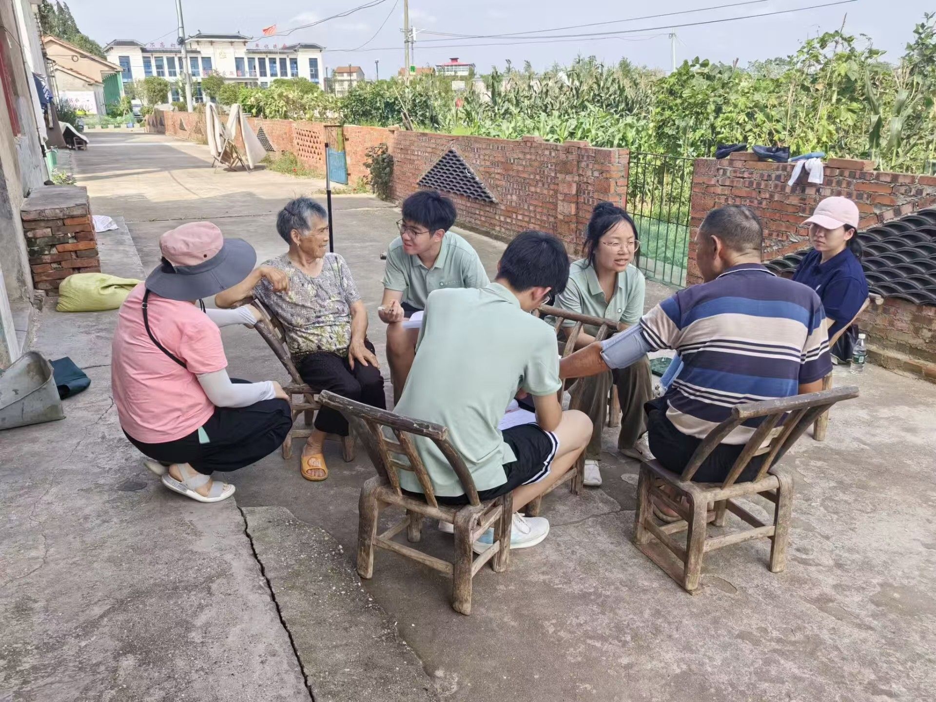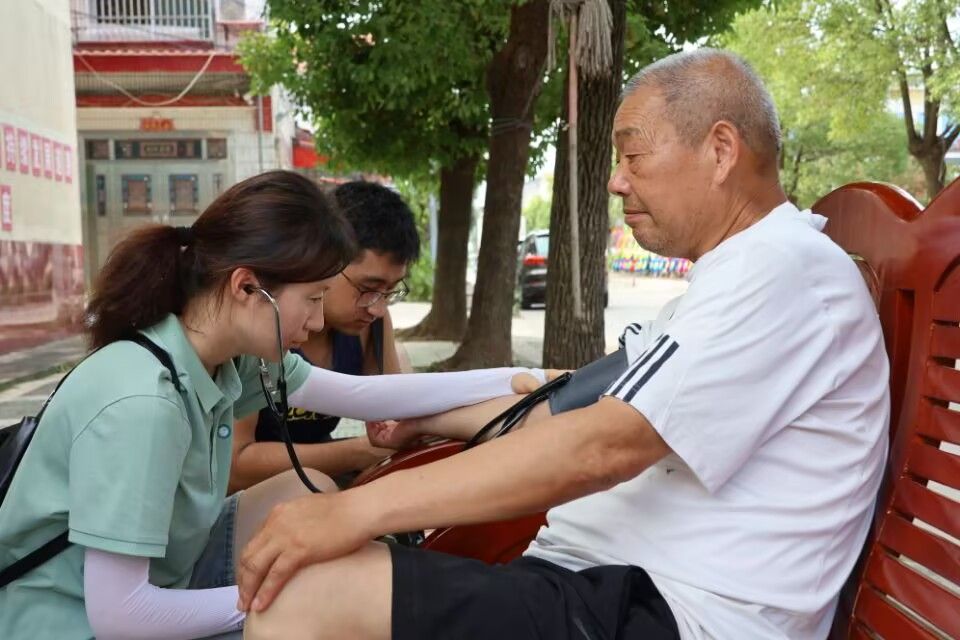 医学部实践队员为老年人量血压 肖善明摄
