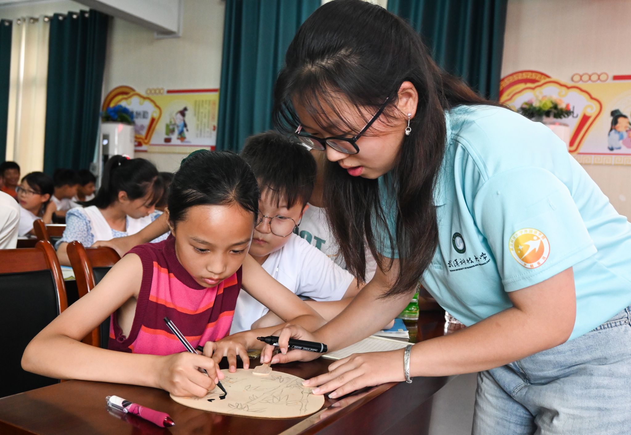 老师帮助学生绘画清廉扇 欧阳一茗摄