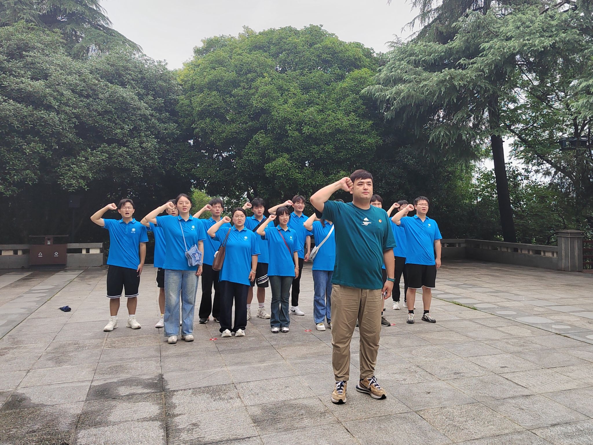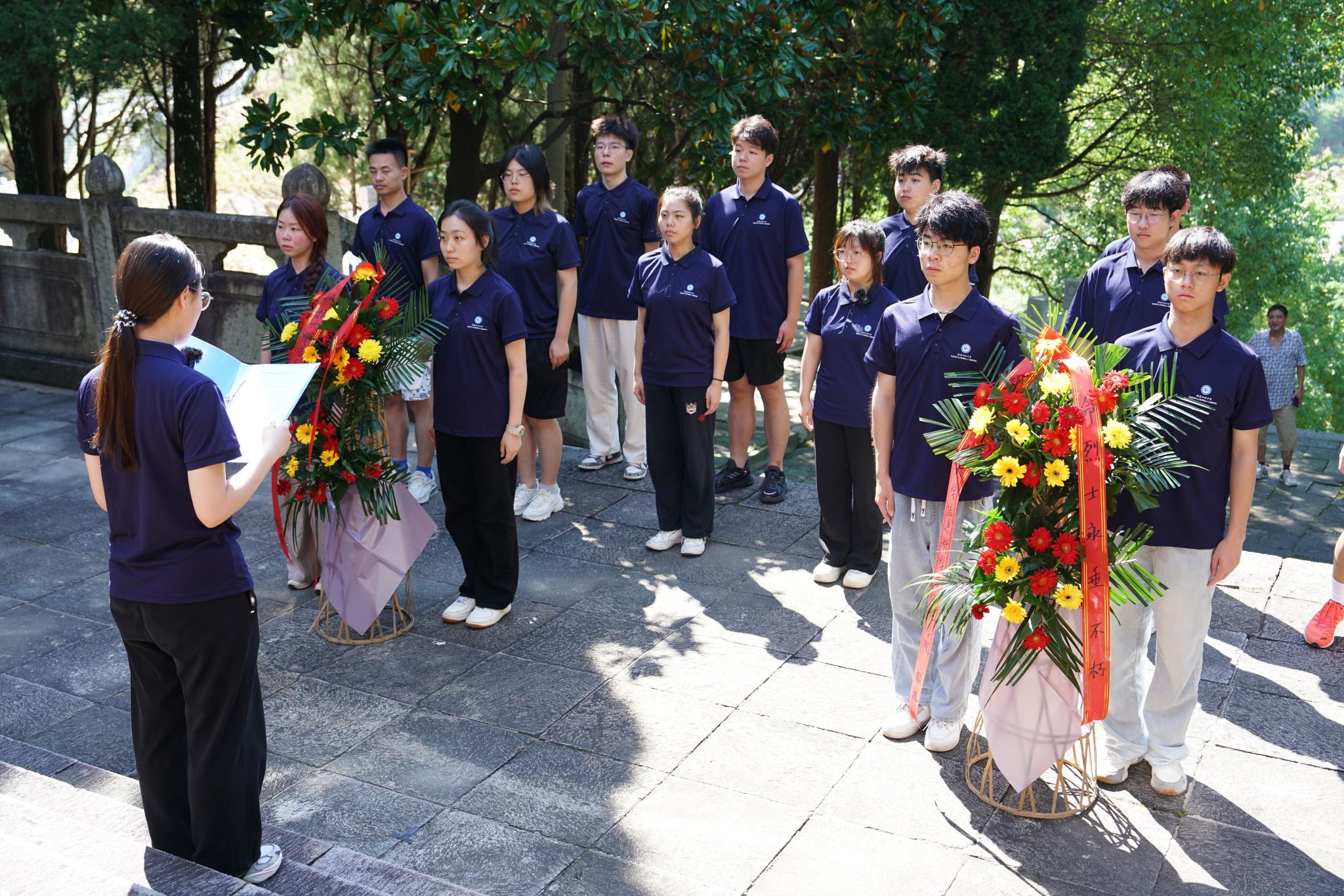 带队教师带领实践队成员们在烈士陵园前宣重温入团誓词 湛演摄