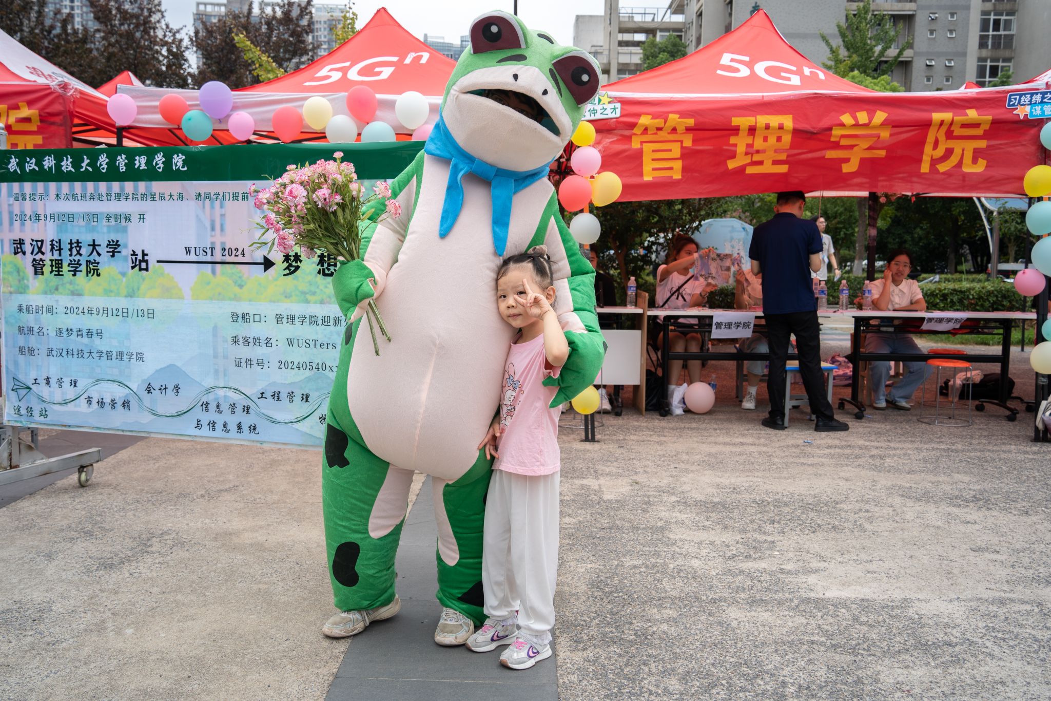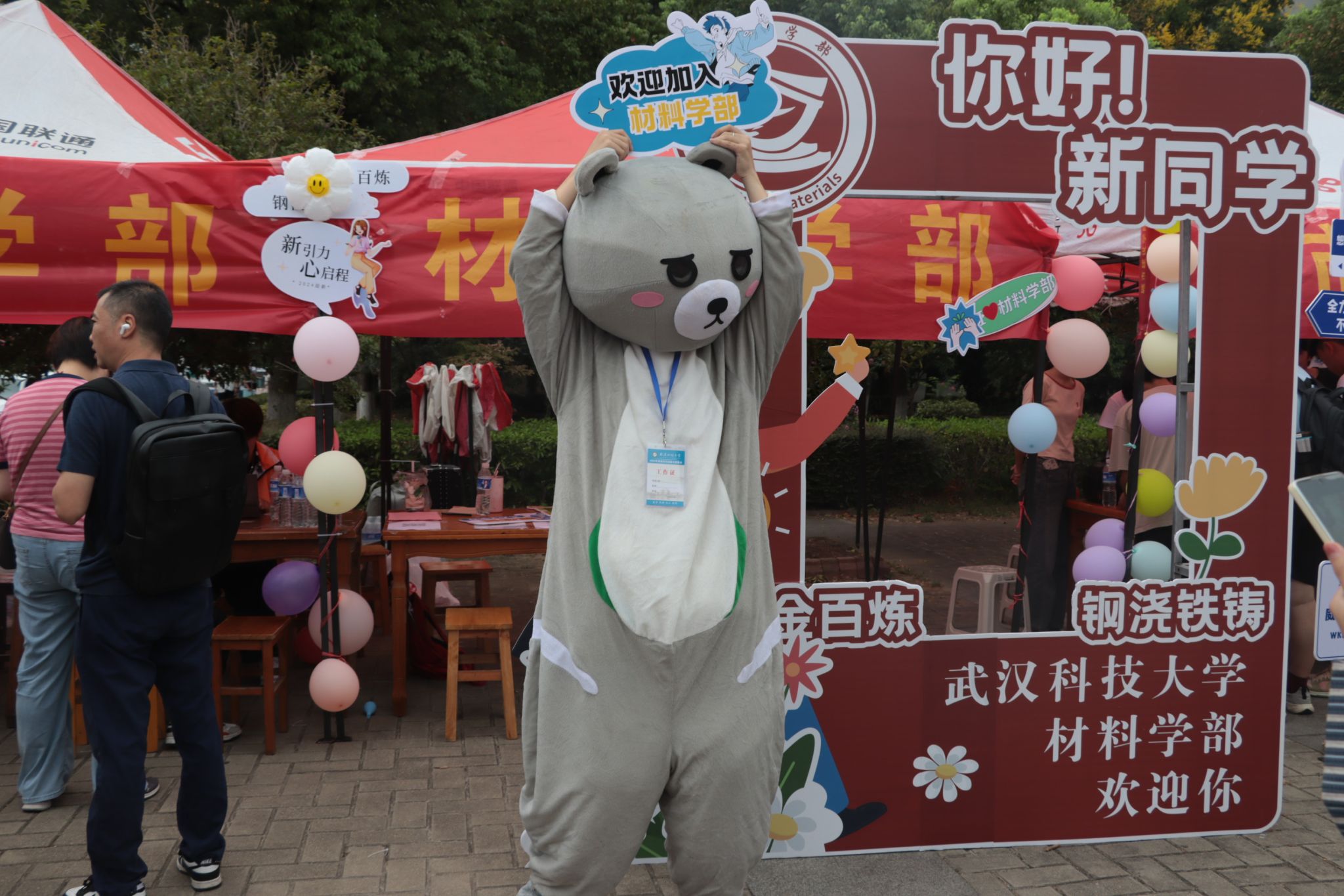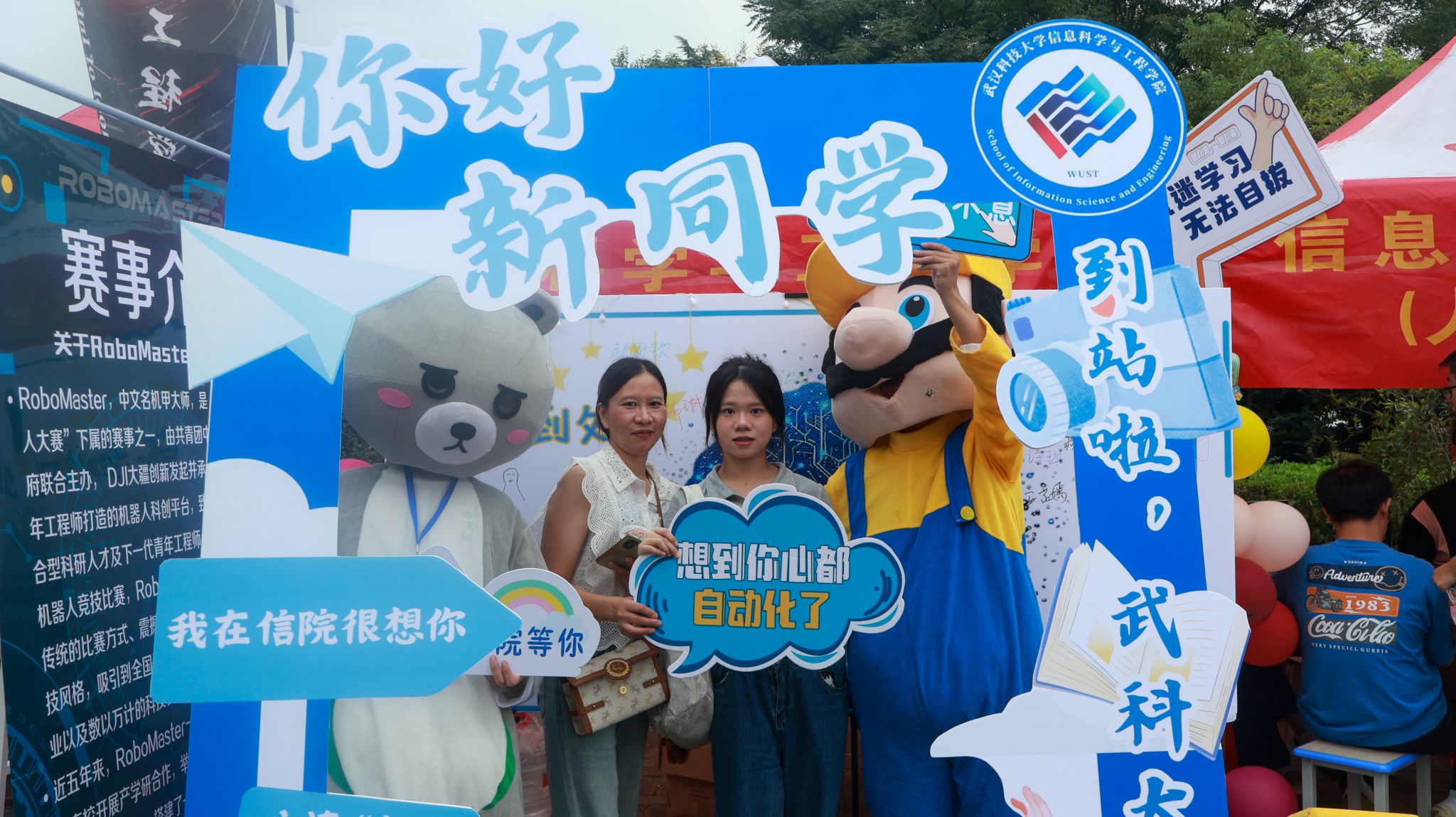 陪同新生报道的小朋友与吉祥物合影 孙奕哲摄