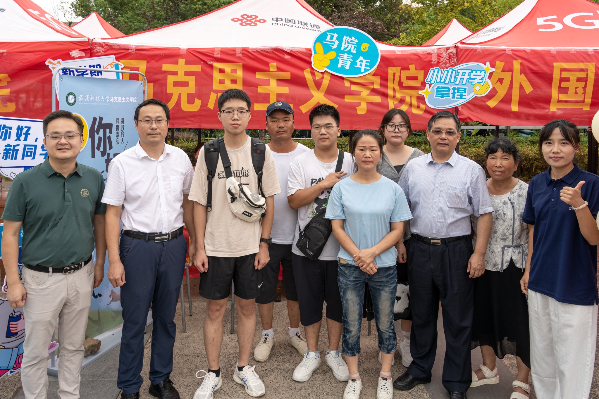 马克思主义学院党委书记唐忠义,院长刘文波,党委副书记、副院长郭海沙与新生合影 孙奕哲摄