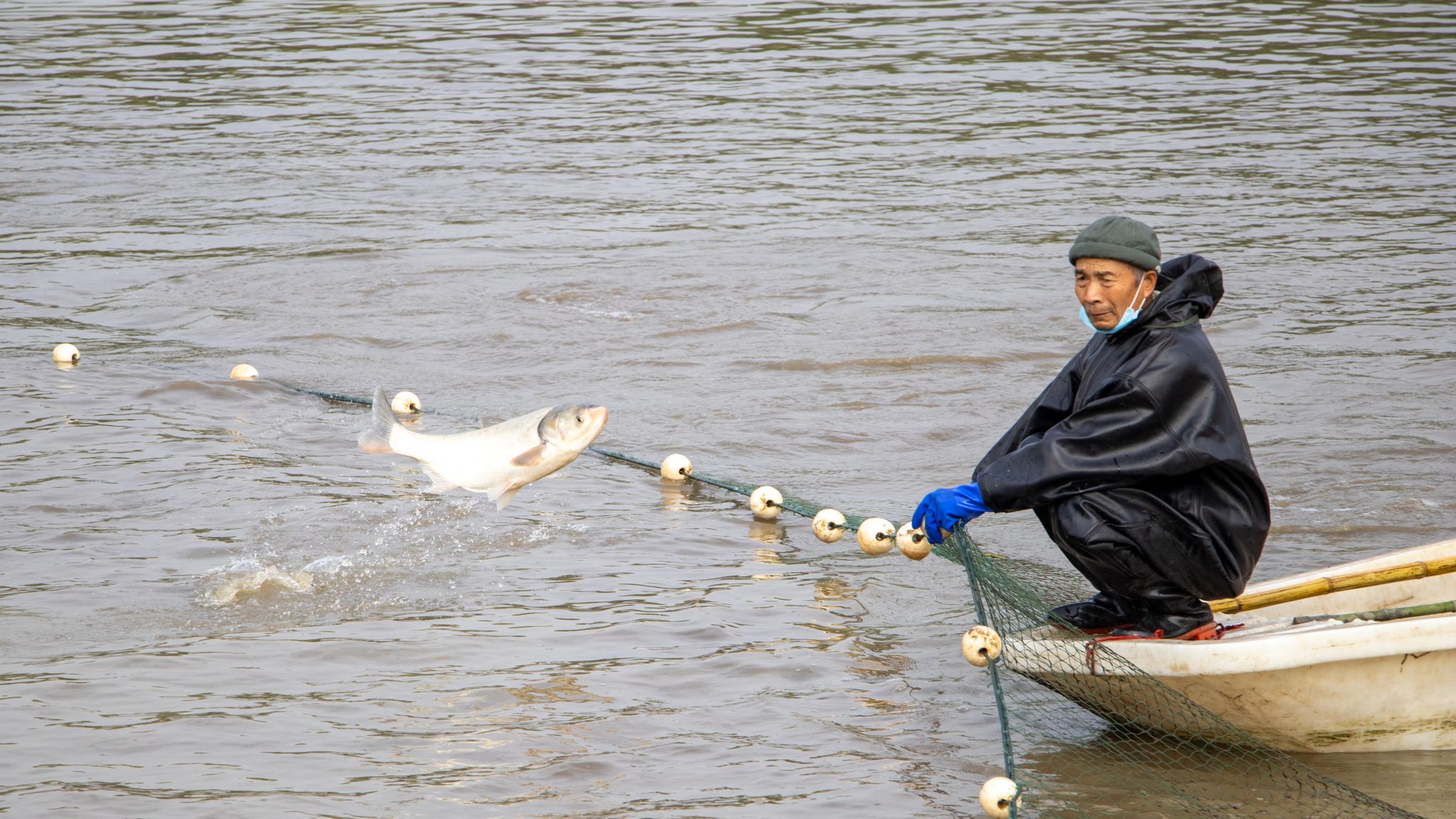 拉鱼后勤爷爷与跃出的鱼特写 陈楷林摄