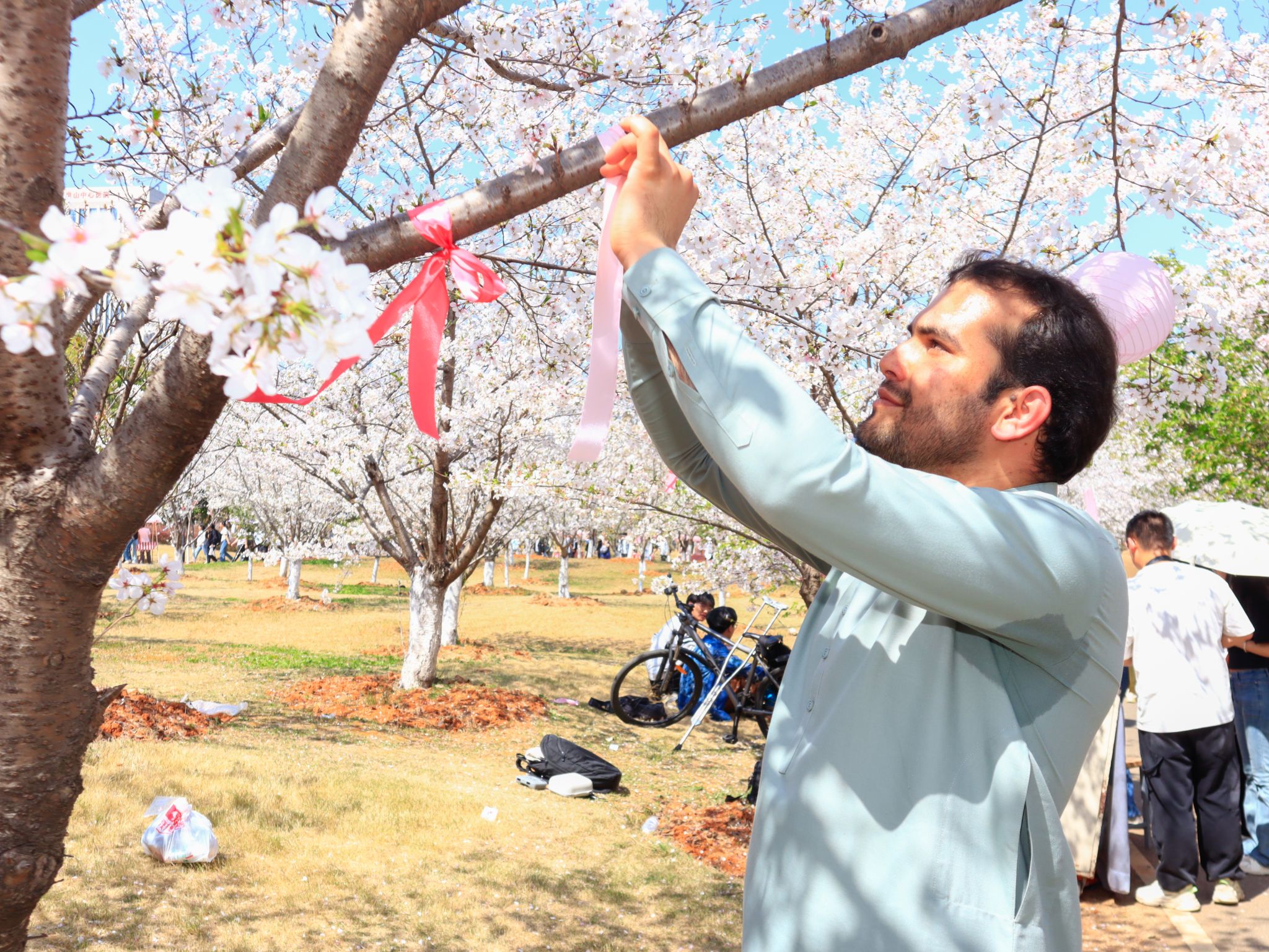 留学生柯海为樱花树系绸缎 王铭浩摄